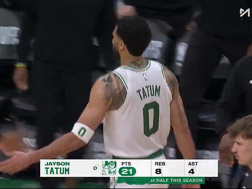 半场结束,塔图姆11中7,三分4中1罚球6中6,得到21分8篮板4助攻2抢断,正负值+13