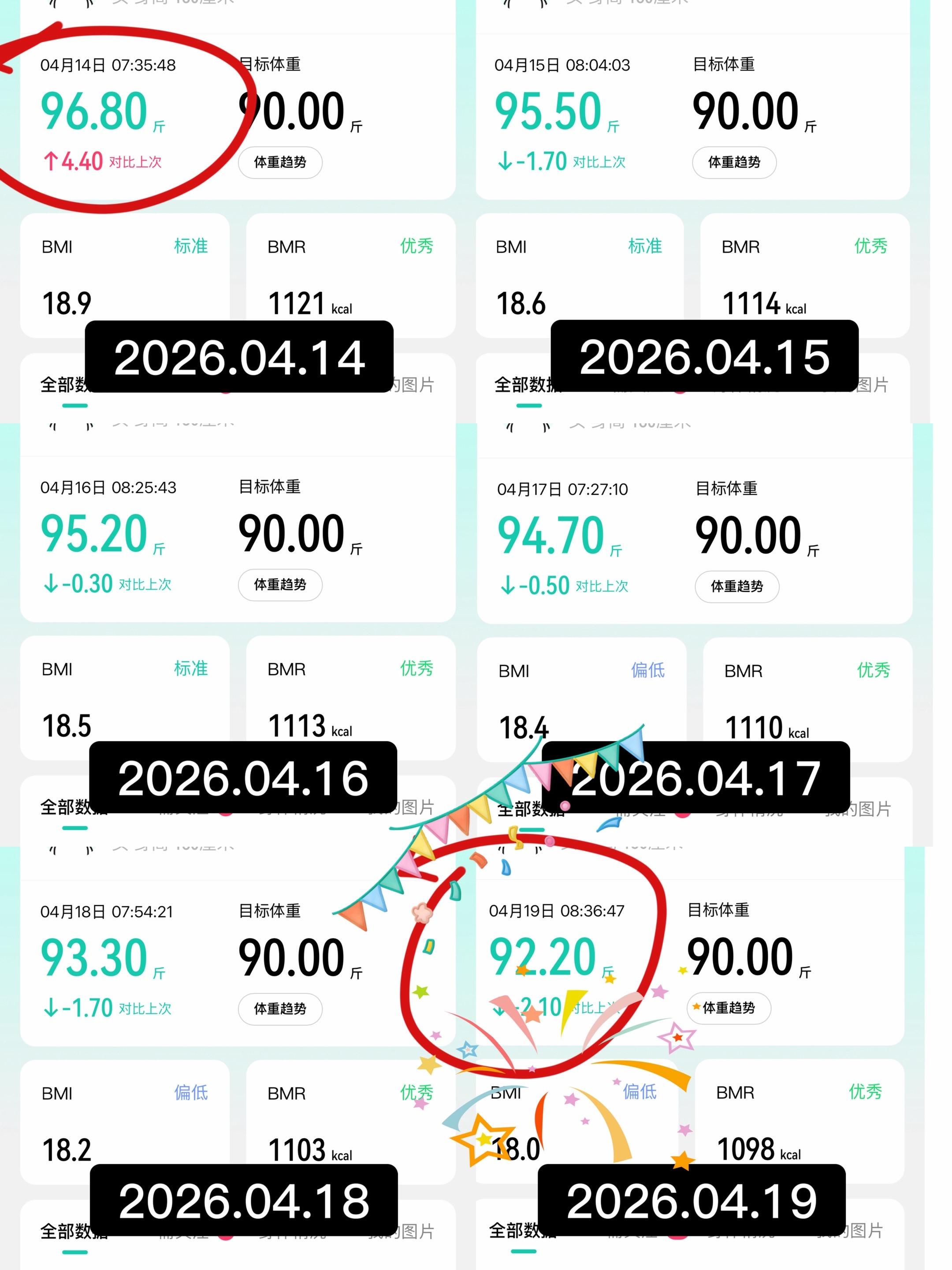 📝五周狂掉9.8斤!减脂三餐+运动。📊减脂数据:4.14-4.19,102斤→92.2斤
