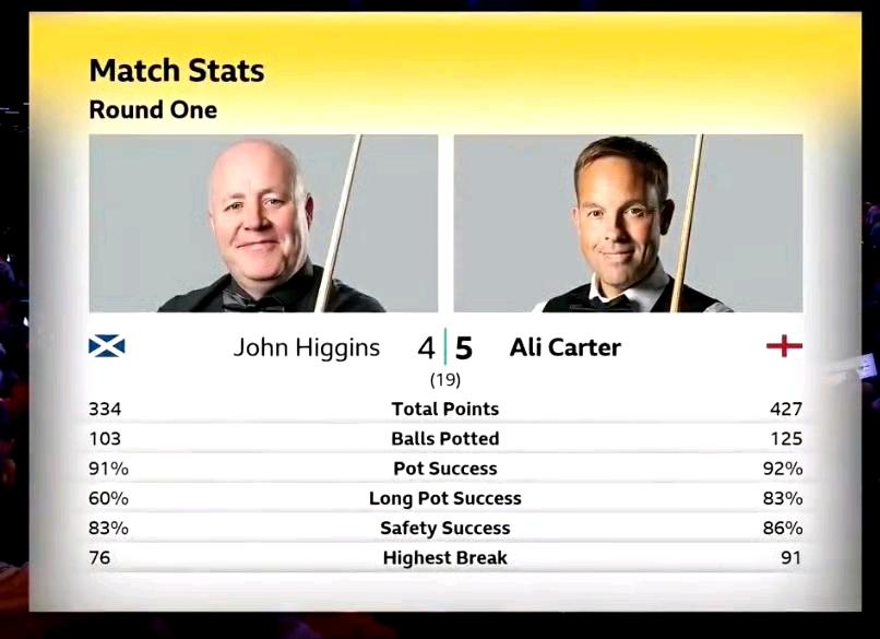 第一阶段结束,希金斯4-5落后卡特。