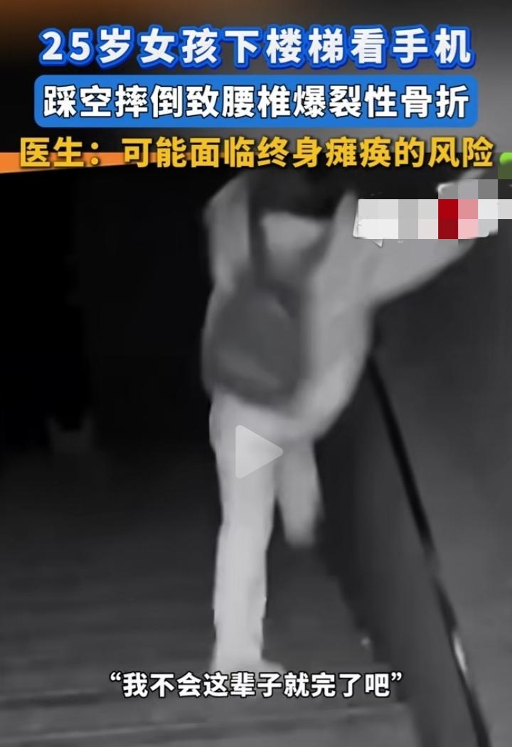 最近一个25岁姑娘刷手机刷出大祸,下楼梯全程低头看屏幕,没留神台阶直接踩空,整个人狠狠摔在楼梯上,当场疼得动弹不得。