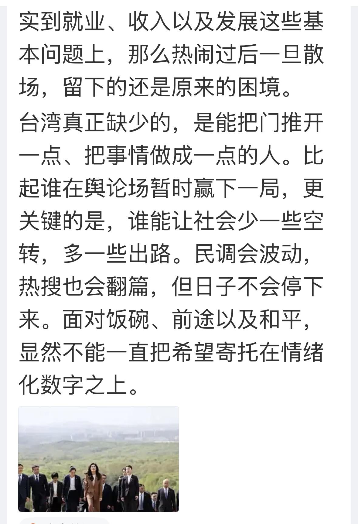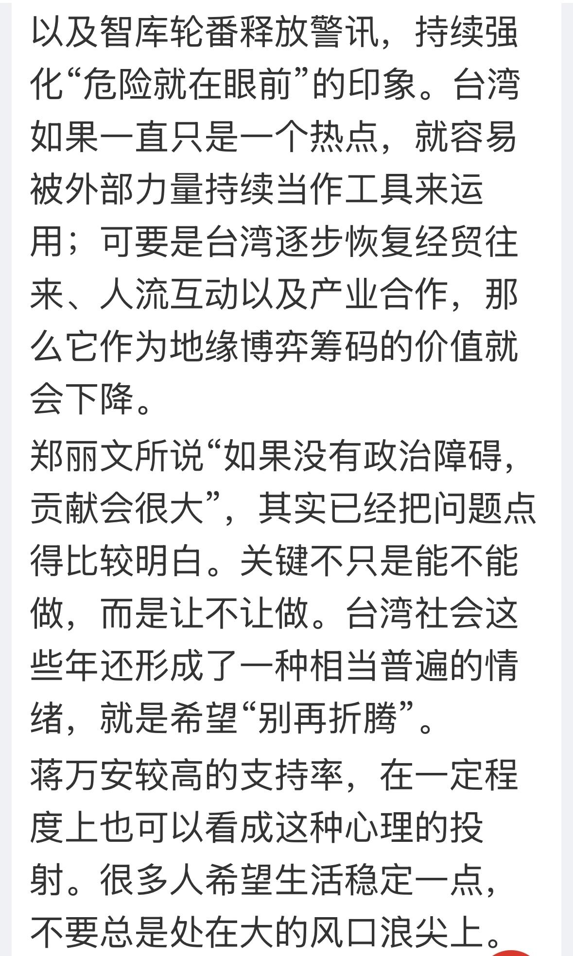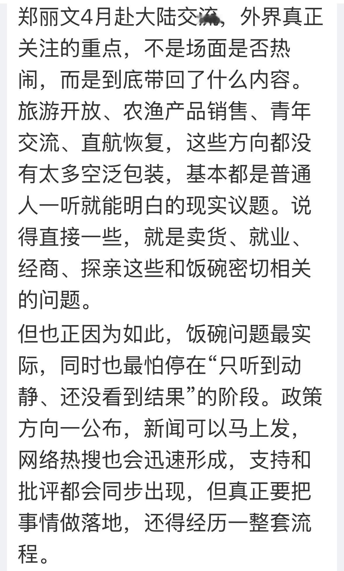 郑主席访问大陆,将两岸关系往前面推动了一大步,这就是成功,非常成功的一次访问,意义重大!台湾的民调说明了台湾问题的复杂性,蒋万安民调好,郑主席民调不太好,这个现象,让很多人看的一头雾水,这就是台湾!如果这都看不懂,就不要评论台湾问题了,大部分的评论都是完全从我们自己的思维角度,评论台湾,听起来都对,都挺正确,其实,与事实有很大差距,哪怕央视评论员也有这样的问题,这也是李莉、宋忠平、杜文龙他们的问题,沈逸节目很好看,好像什么都懂,为什么判断都错?就是这个意思,讲中日关系,要了解日本人什么反应?讲中美关系,要分析美国人的反应,把国际问题,都当成自己的问题,肯定就怕断不准。台湾问题,虽然是国内问题,但是,同样是这样,台湾那边的社会结构,和我们不一样,反应也是不一样的。所以,才讲要久久为功、愚公移山、精卫填海!