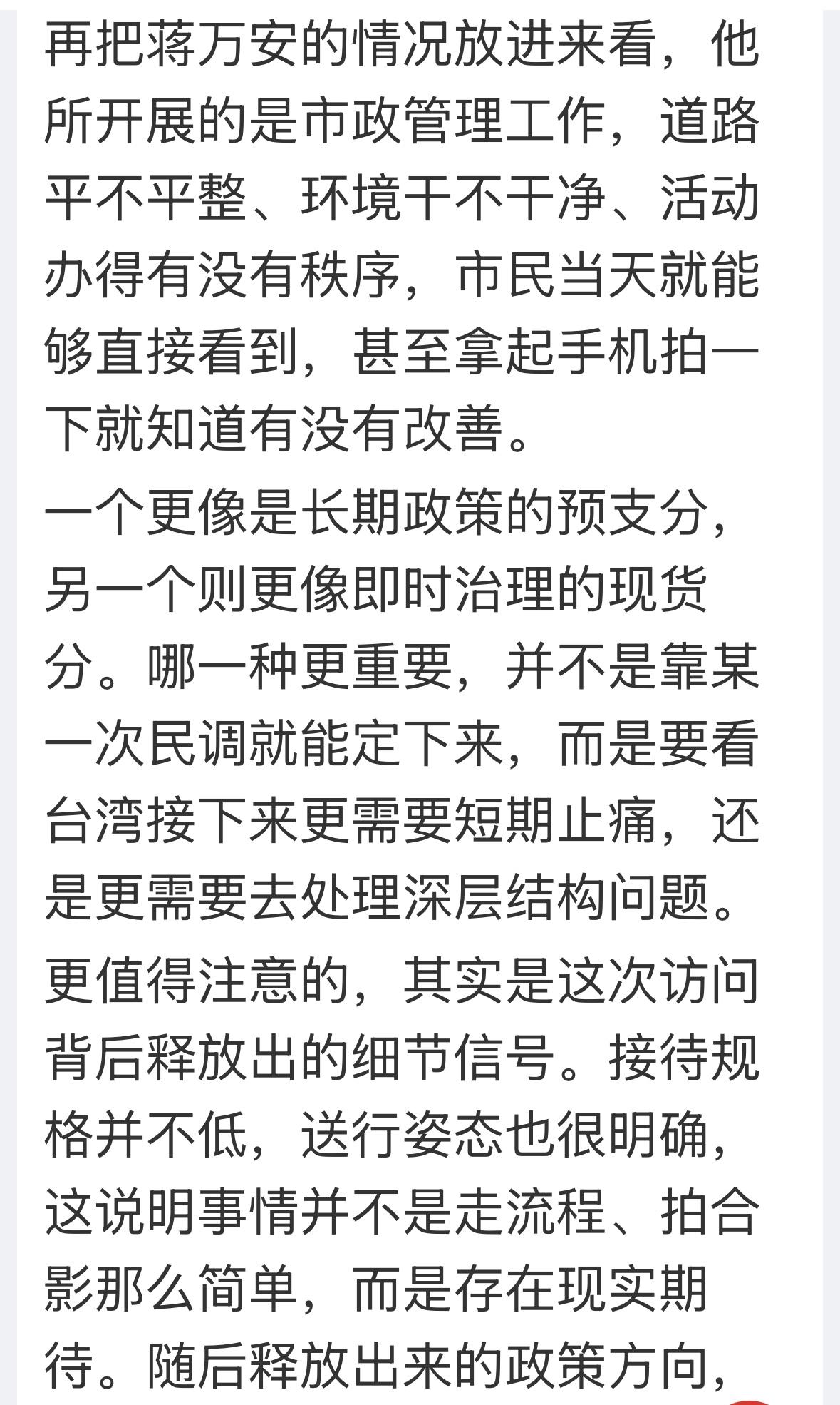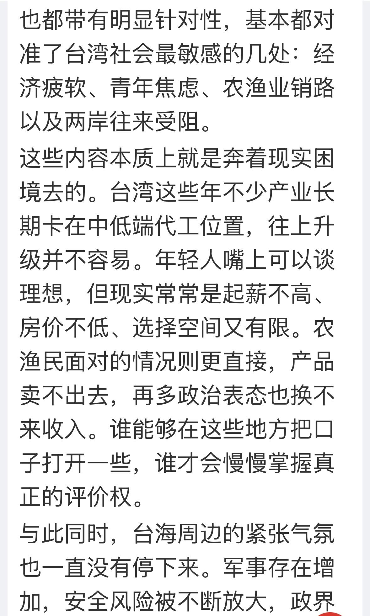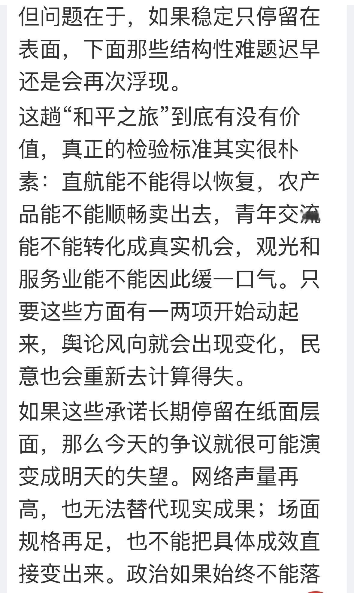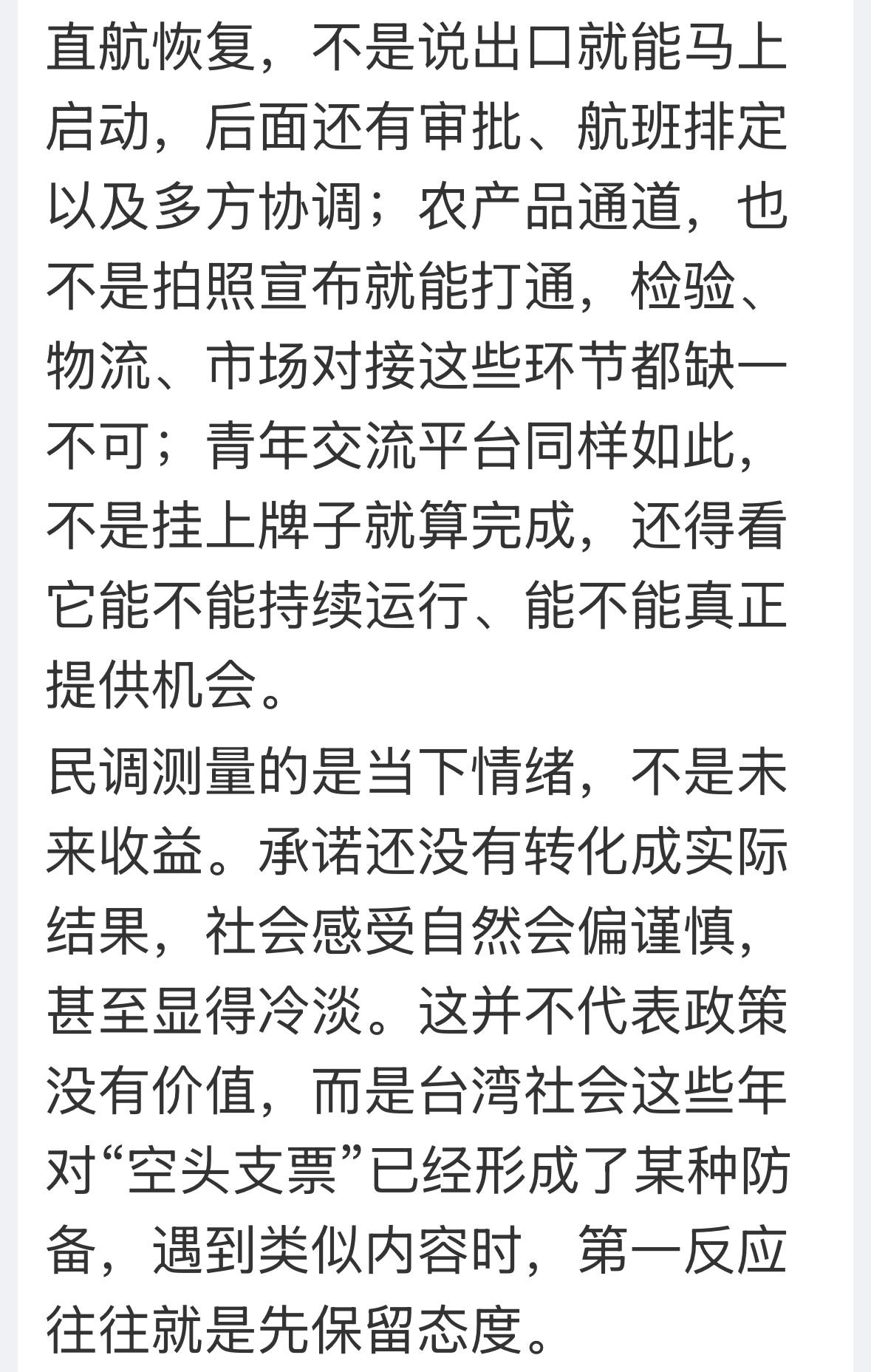 郑主席访问大陆,将两岸关系往前面推动了一大步,这就是成功,非常成功的一次访问,意义重大!台湾的民调说明了台湾问题的复杂性,蒋万安民调好,郑主席民调不太好,这个现象,让很多人看的一头雾水,这就是台湾!如果这都看不懂,就不要评论台湾问题了,大部分的评论都是完全从我们自己的思维角度,评论台湾,听起来都对,都挺正确,其实,与事实有很大差距,哪怕央视评论员也有这样的问题,这也是李莉、宋忠平、杜文龙他们的问题,沈逸节目很好看,好像什么都懂,为什么判断都错?就是这个意思,讲中日关系,要了解日本人什么反应?讲中美关系,要分析美国人的反应,把国际问题,都当成自己的问题,肯定就怕断不准。台湾问题,虽然是国内问题,但是,同样是这样,台湾那边的社会结构,和我们不一样,反应也是不一样的。所以,才讲要久久为功、愚公移山、精卫填海!