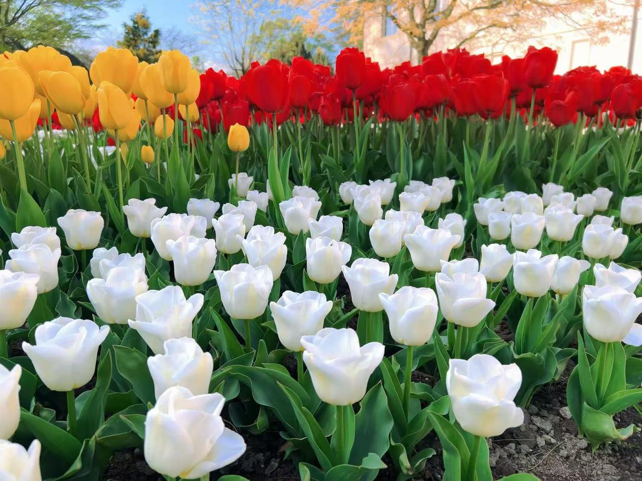 春日花海中的优雅时光,粉嫩郁金香映衬下的静谧美好。