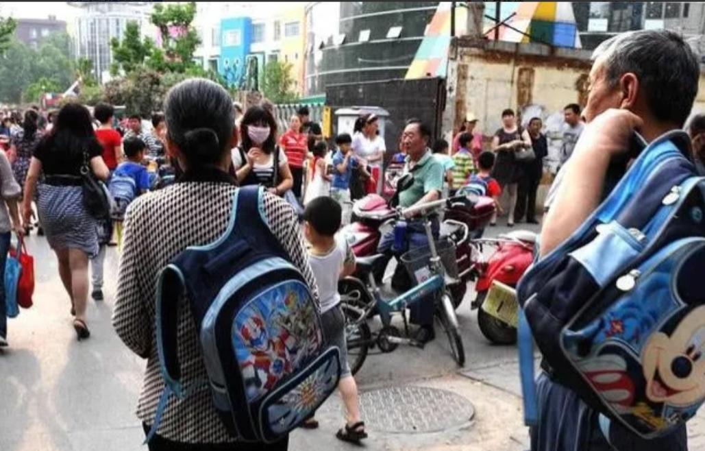 还有看着他给孙子背着书包,右手还提着一个水壶。