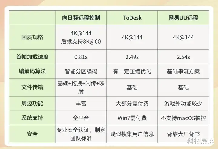 虽然三者均支持4K分辨率和144帧率,且向日葵未来还将支持8K60帧,但在首帧加载速度上差距明显。