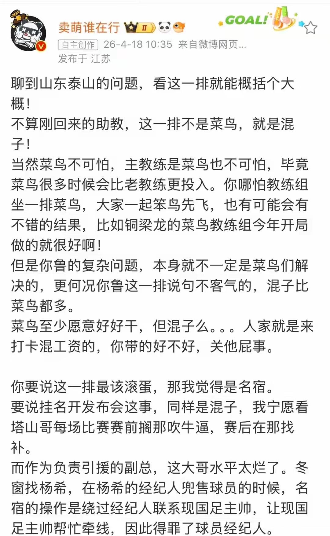 博主“卖萌谁在行”称泰山教练组就是菜鸟加混子,而且混子比菜鸟都多。