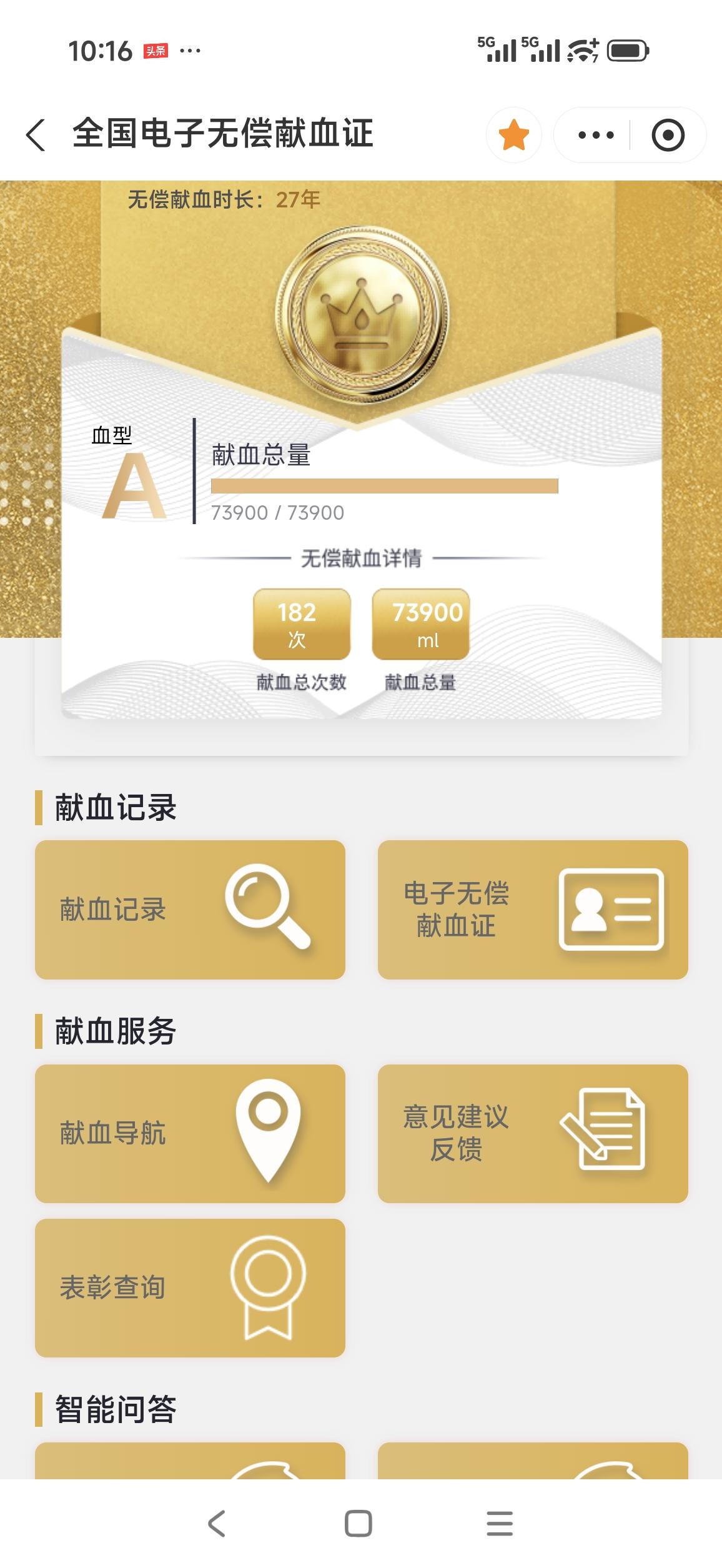 截至2026年4月18日 本人已经无偿献血28年。捐献全血6400毫升,成分血298治疗量,总计73900毫升。荣获全国无偿献血奉献奖金奖六次,终身荣誉奖获得者。