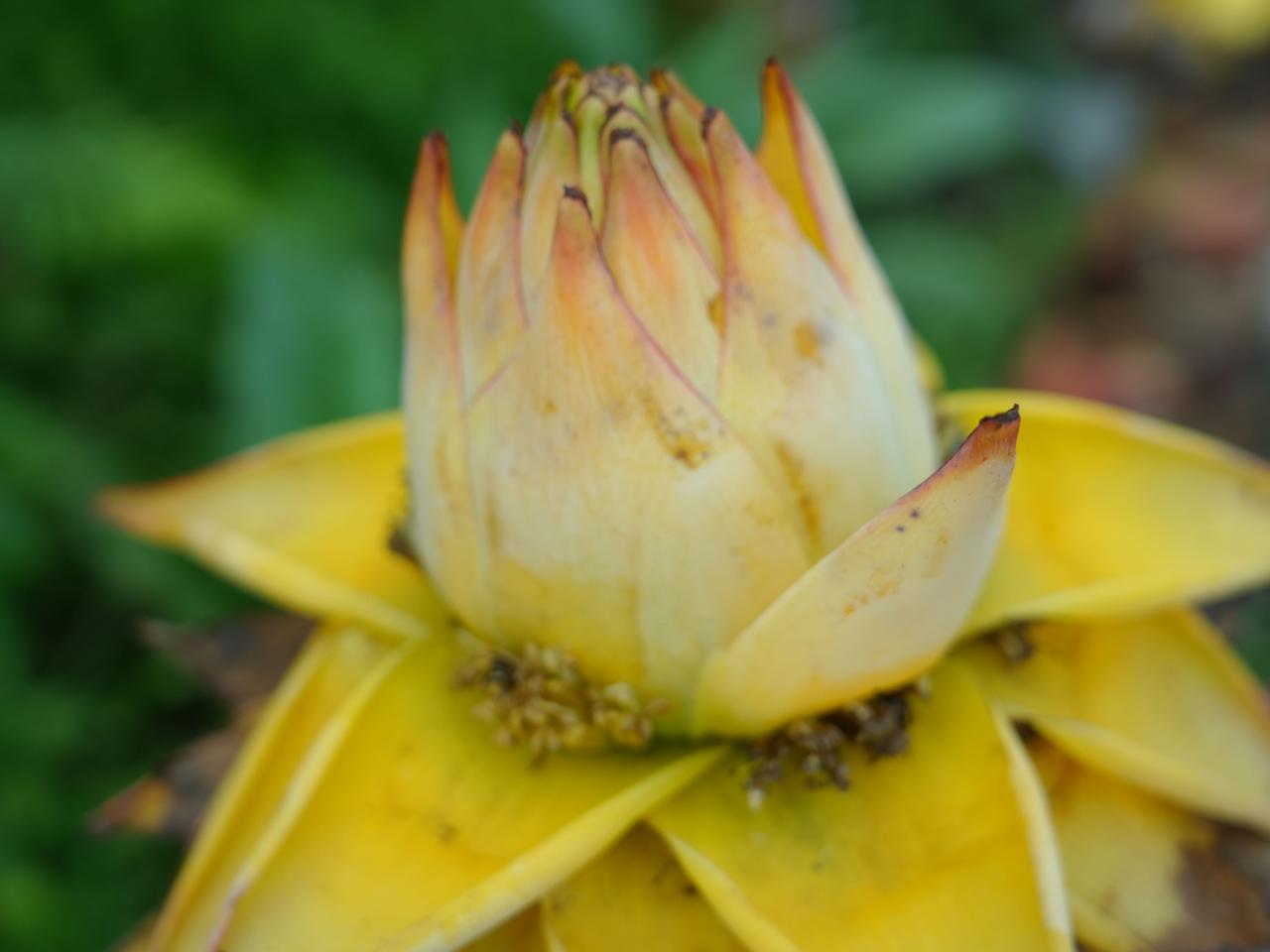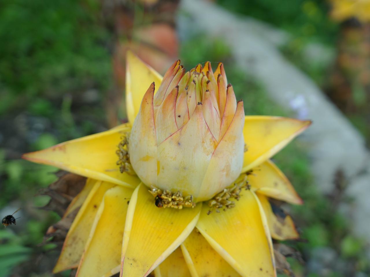 寺里的水泥地边上,摆着旧香案,旁边还放着个灰色的垃圾桶,香客们来来去去,对着佛像拜,对着花拍,可这几株地涌金莲就安安静静立着,一点也不闹。凑近了看,茎干粗粗的,带着一圈圈褐色的老皮,有点像裹着层鳞片,从土里直直往上冒,也就半米来高,不算起眼,可顶端那片金黄,一下就抓住人眼睛了。那一片片黄瓣儿,从下往上一圈圈排开,一层托着一层,中间裹着个淡绿带点红尖的花苞,细看才发现,真正的小花藏在黄瓣儿底下,小小的,嫩黄嫩黄的,连蜜蜂都围着打转,嗡嗡地采蜜。寺里的师父说,这黄瓣儿其实不是花瓣,是苞片,真正的花藏在里面,花期长着呢,单株能开三到六个月,从四月一直开到十月,大半年都不谢,也算是耐得住性子了。