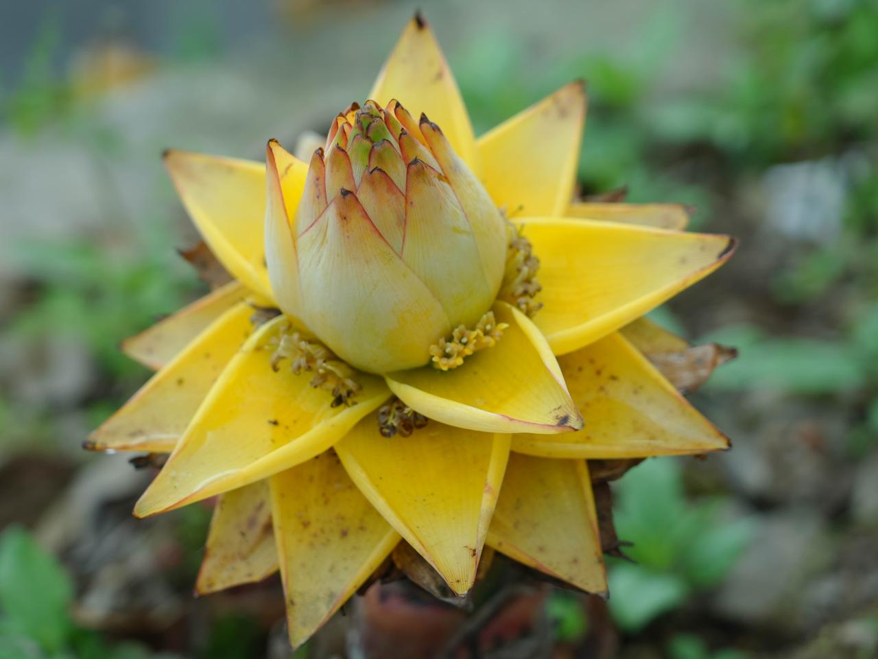 在我印象里,莲花都是长在水里的,沾着水汽,干干净净的,可这地涌金莲,偏长在寺里的红土和水泥地下,像个不挑地方的孩子,凭着一股劲儿往上长。它跟芭蕉沾点亲,是芭蕉科的草本,寺里的几株叶子不算多,反倒把顶端的金黄衬得更亮。寺里的师父说,这花是佛教里的圣花,传说佛祖刚生下来的时候,走一步脚下就开一朵金莲,说的就是它;以前佛陀讲经的时候,也说有 “天花乱坠,地涌金莲” 的吉兆,所以寺庙里种它,既是敬意,也是讨个吉祥。看着红墙下的金黄,听着寺里的钟响,忽然就觉得,这花不娇气,就像从土里长出来的一盏灯,安安静静的,却很稳。