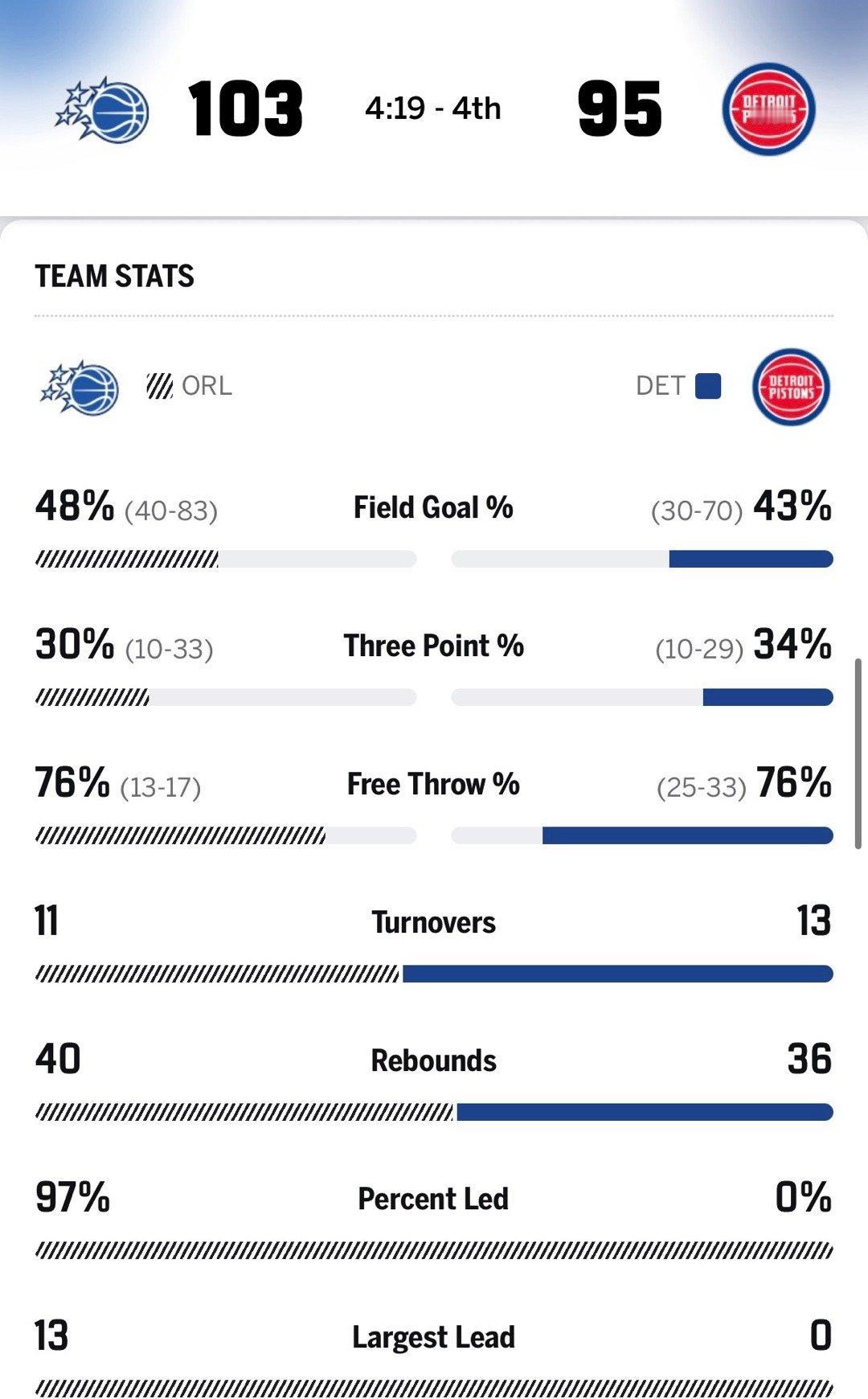 黑八来了?会是第一场下克上吗?距离比赛结束还有5分钟,活塞93-103落后魔术10分。