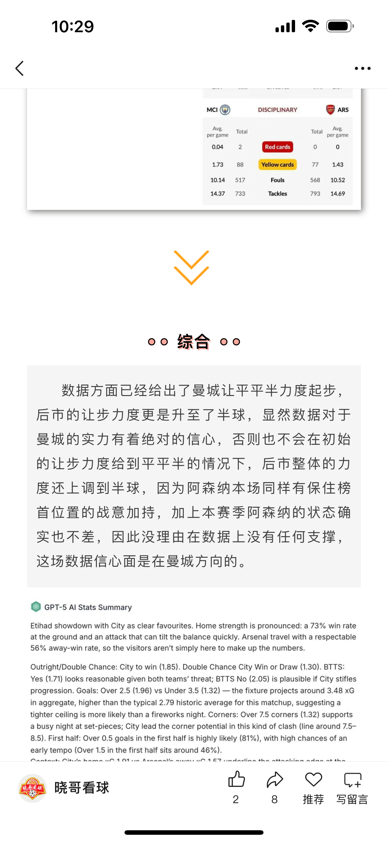 昨日公推英超曼城方向成功获得好评,这场比赛在16分钟由谢尔基的边路突破破门得手,曼城抢攻战术成功,阿森纳后防的伤病还是留有隐患,而且阿森纳体能明显有些跟不上,在下半场阿森纳主攻的情况下,后防也继续给曼城留有了反击的机会,最终由哈兰德第65分钟的进球锁定了优势,在之后阿森纳势头已去,最终收获1:2的败果,这场好评合理。体彩足球预测曼城曼城vs阿森纳体育赛事