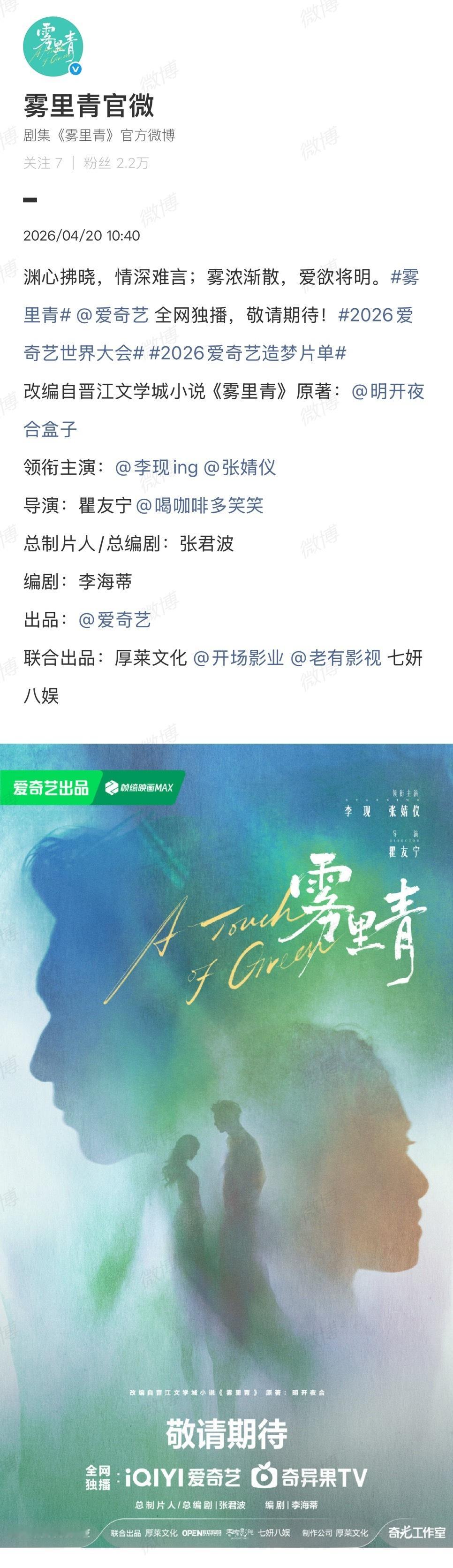 由李现、张婧仪领衔主演的《雾里青》正式发布官宣海报,期待两位的合作李现张婧仪雾里青阵容官宣雾里青李现张婧仪领衔主演 2026爱奇艺世界大会
