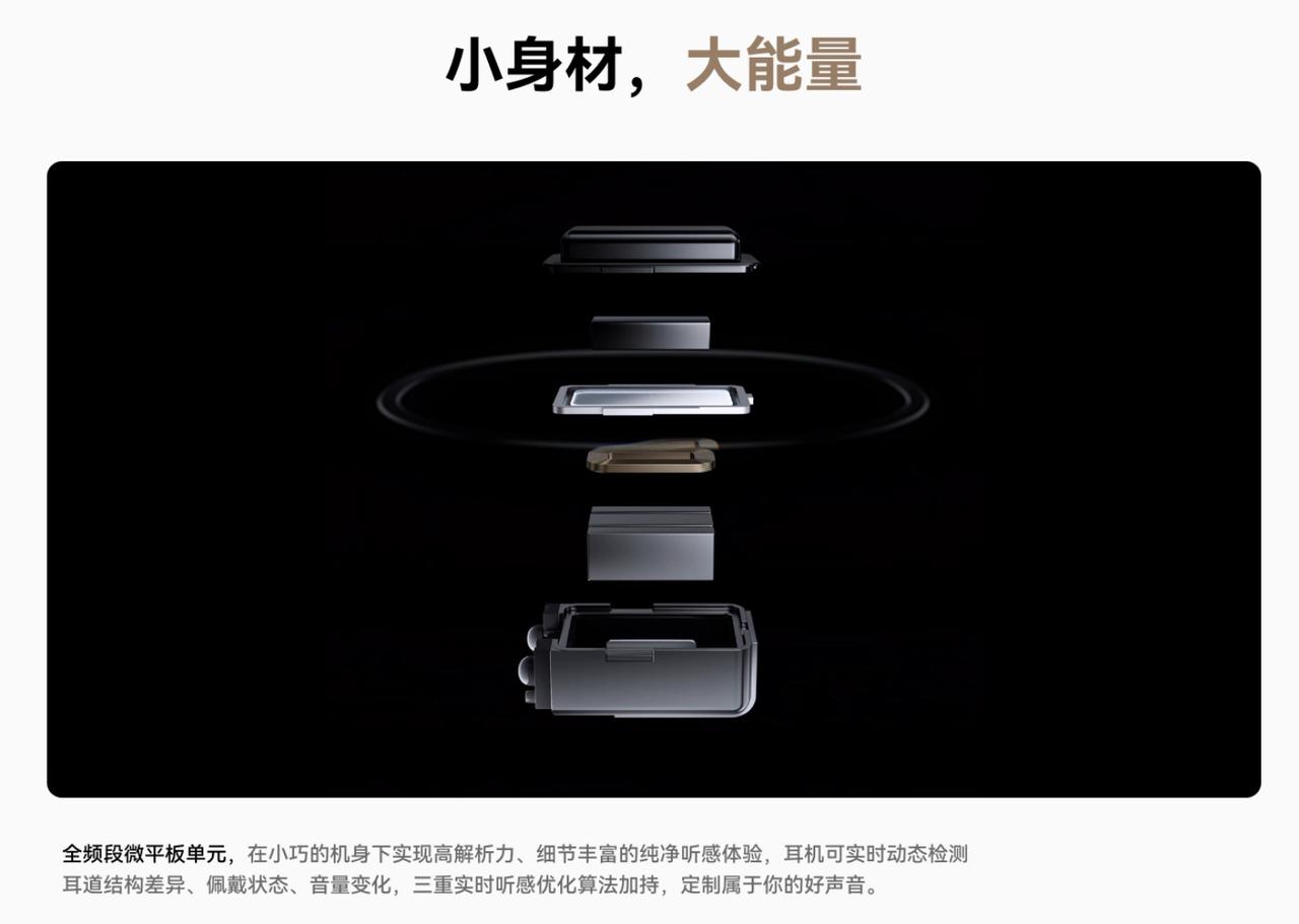 - 耳机:单只耳机重 4g,左右耳自适应,全频段微平板单元,支持主动降噪、透传模式,骨传导麦克风,支持广域耳廓触控。
