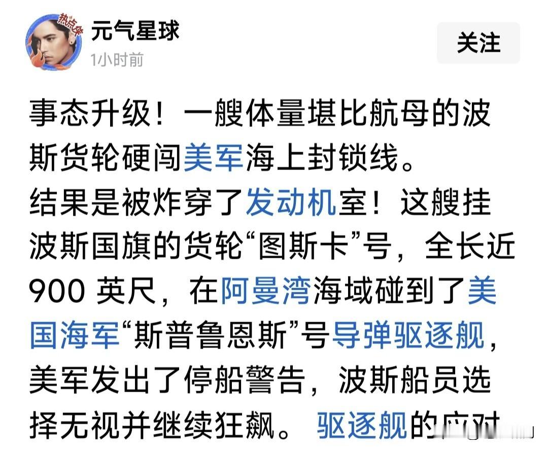 伊朗方面称:对于美军击伤伊朗货轮,已用无人机进行回击,攻击美军多艘军舰。至于有无伤损,尚无具体信息。