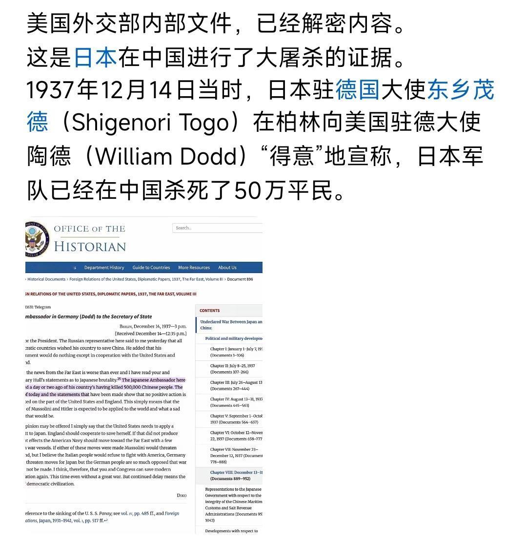 美国外交部,刚解密的文件,再次披露日本侵华暴行! 1937年12月14日,日本驻德国大使,亲口向美国驻德大使吹嘘:日军杀死了中国50万军民。 美国大使强烈建议美国对日本实施经济抵制,并以海军力量施压。