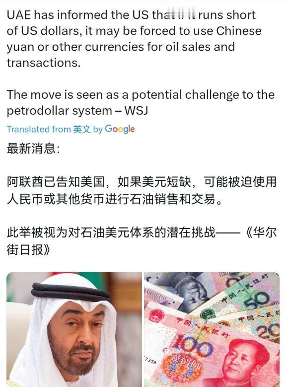 4月20日,根据美国华尔街日报报道,美媒称,阿联酋已告知美国,若出现美元短缺,该国可能被迫使用人民币或其他货币进行石油销售与交易。美媒称,此举无疑是对石油美元体系的潜在挑战。