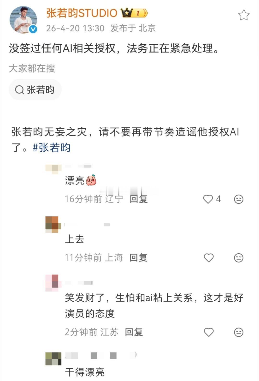 张若昀工作室 没签过AI授权 支持维权!张若昀此前也在采访中谈及AI说:“可能A