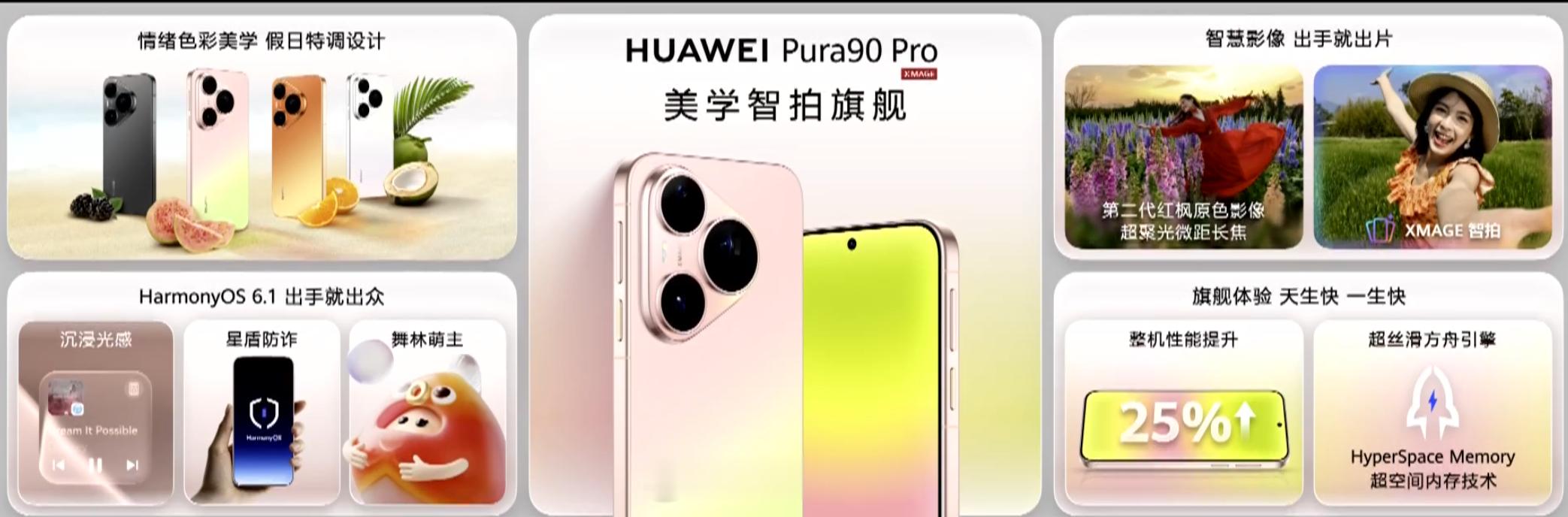 补一下配置,华为 Pura 90 Pro 发布,12GB+256GB 售价 5499 元,12GB+512GB 售价 5999 元,16GB+512GB 售价 6499 元,16GB+1TB 售价 7499 元;