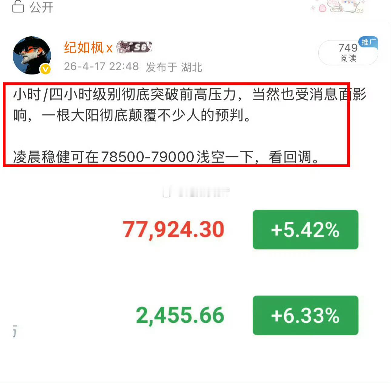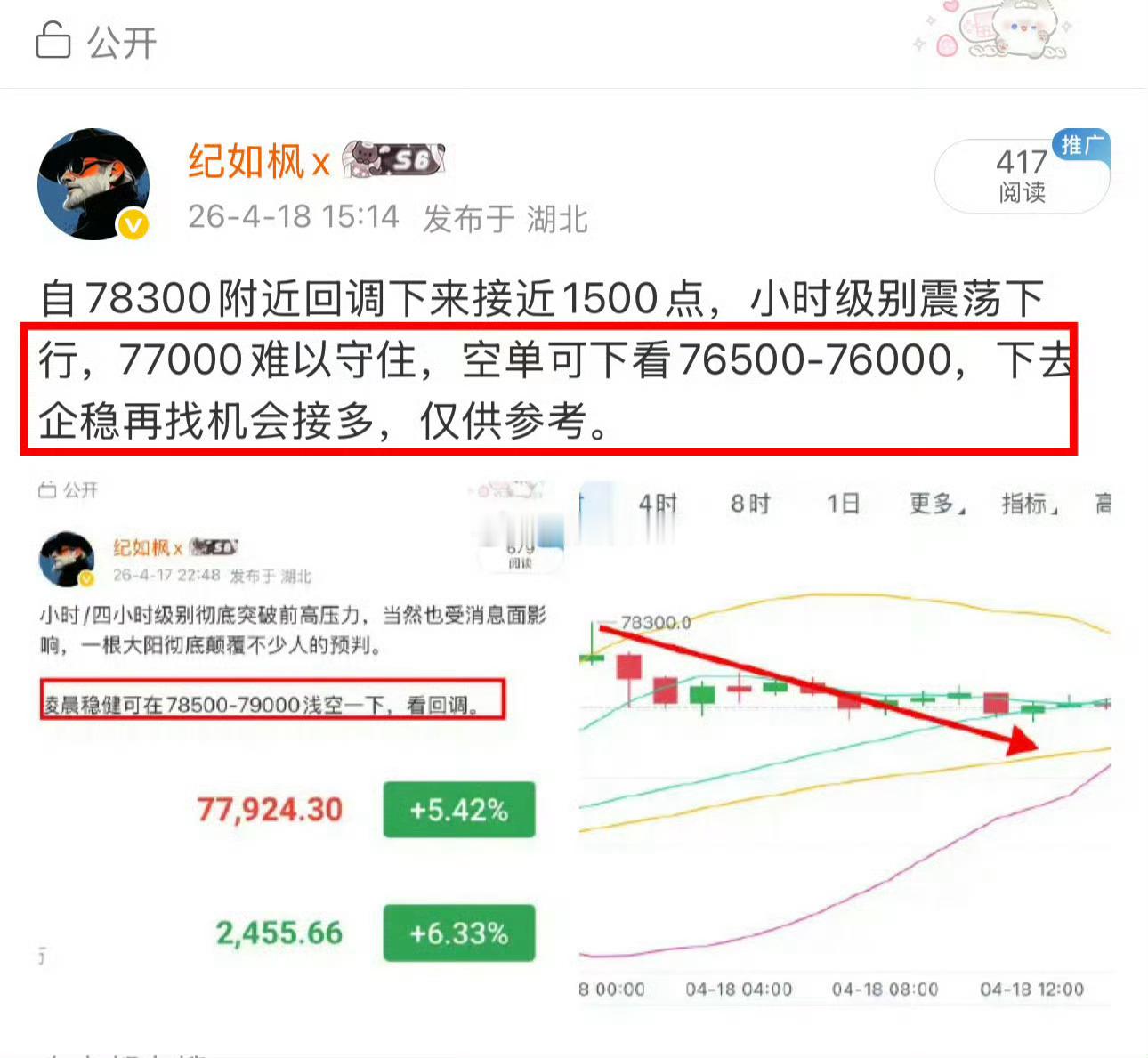 那天老纪提醒的78500附近稳健箜,我们在78000附近入头舱,没到78500就没补,有人总喜欢扣字眼,就问你方向对没对?后续提示看到76000也到了。