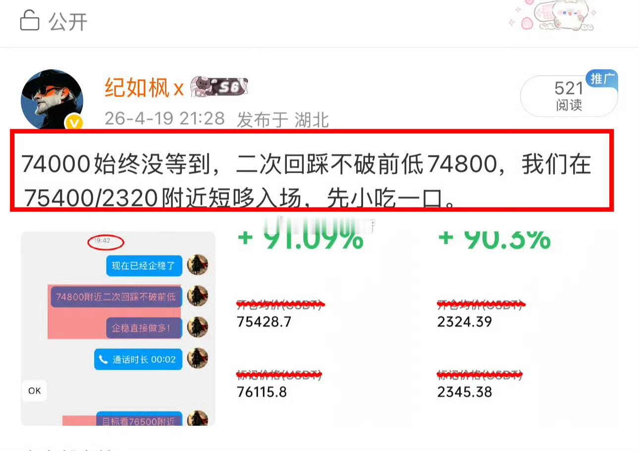 78000空单减仓后,周末在76200附近短多对锁,反弹不佳后续75400扫损,老纪也认了,后续二次回踩74800双底企稳75400短多拿到76100,仅仅是这箪没有公开,并在76200附近提示反手看回调74000也到了,妥妥2000点,还有早间73700附近短多也将近1000点反弹,这两个公开箪整体将近3000点,76200短多损的800点,后面这两箪的空间直接3倍还要多还给各位,够不够意思?