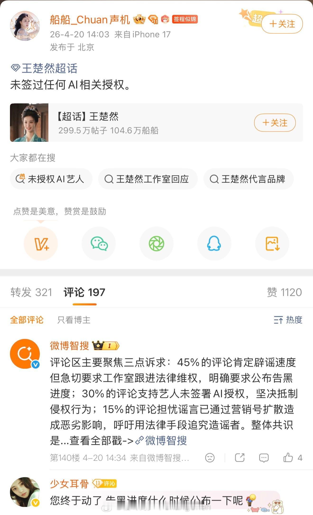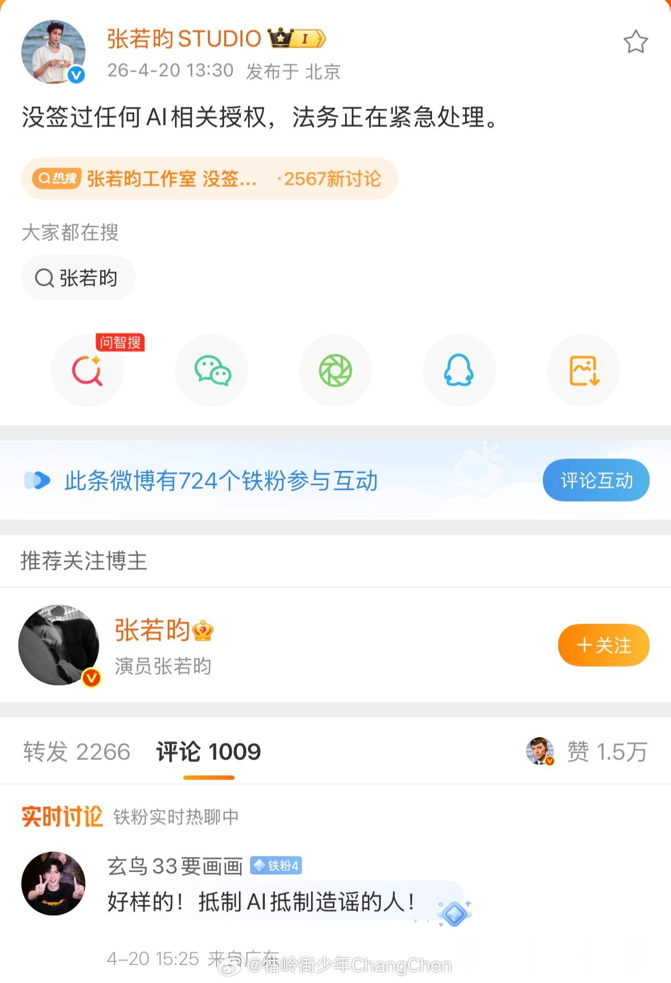 于和伟、张若昀、王楚然工作室接连宣布辟谣,声称没有签过任何AI相关授权,做得好!明星们这次不联合起来抵制,平台慢慢温水煮青蛙那就糟糕了。