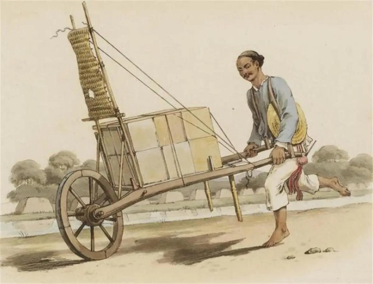 秦汉时期的“辇”便是人力两轮车,多为皇室贵族代步所用,汉魏时期盛行的独轮车,货架设于车轮两侧,既能载货也能载人,且仅一个车轮,便于在田埂、小道通行,大幅提升了人力运输的效率,减轻了人力负担。