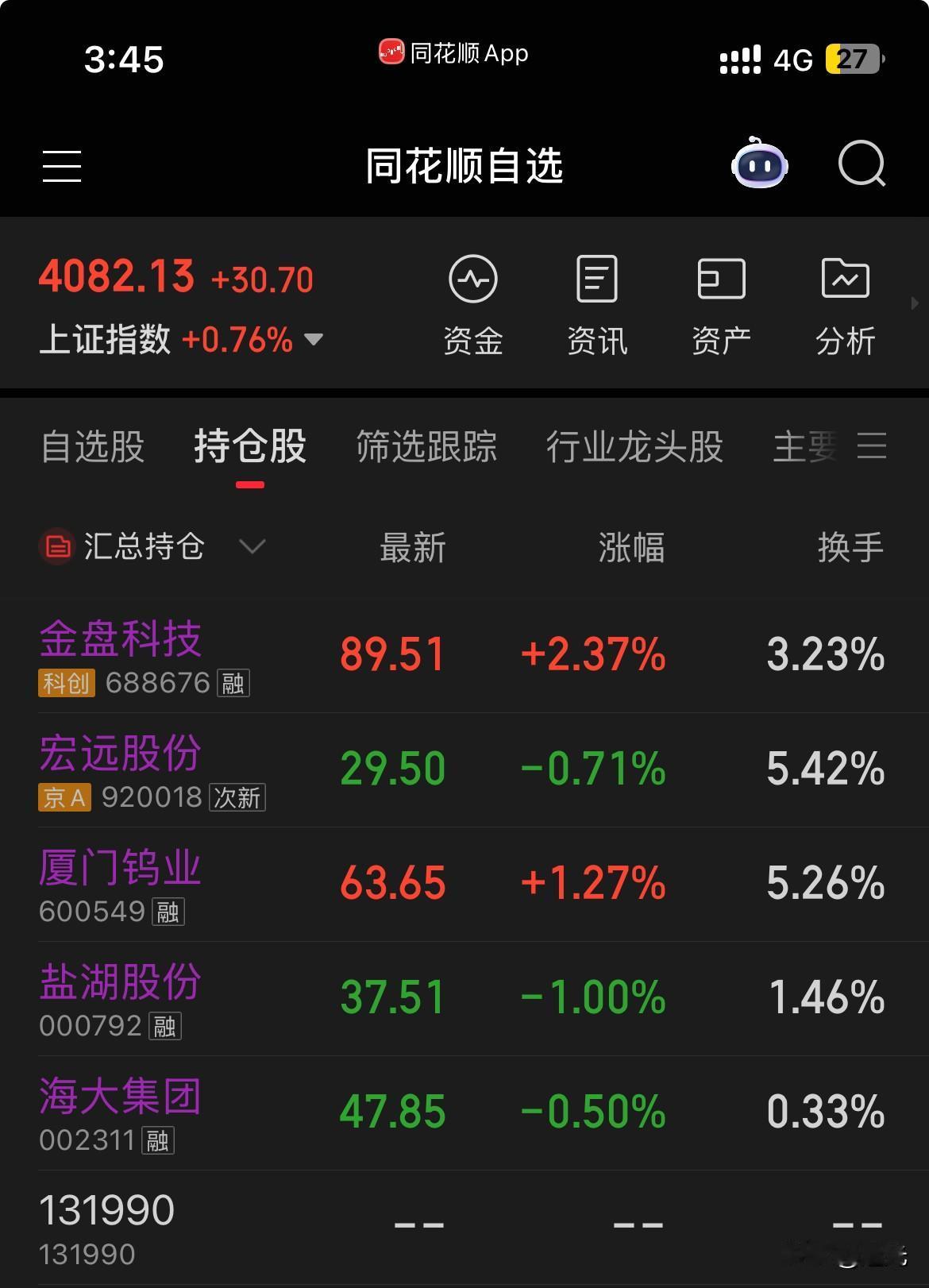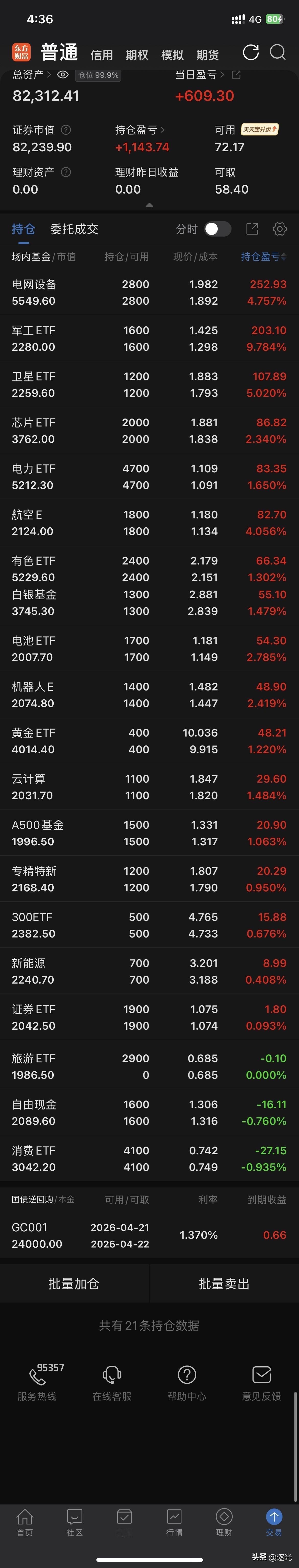 受周末利空消息影响,今天大盘开盘受到抑制。但整体走势并没有很弱,说明中东局势队对A股影响越来越小,A股开始走自身逻辑了。我今天调仓,卖出开发和雅克,加仓金盘,宏远,厦钨和盐湖。整体仓位保持不变,3成多。今天微红3百多。做ETF的东财账户少量买了点旅游,仓位来到7成。