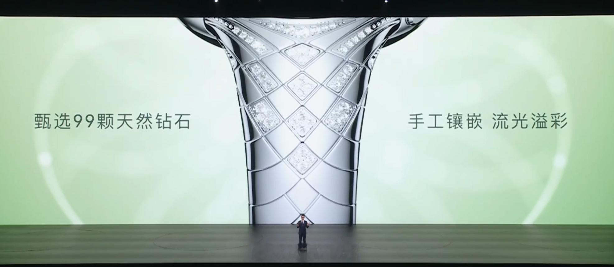 华为非凡大师首款珠宝智能腕表,全表镶嵌了 99 颗天然钻石,蓝宝石表镜
