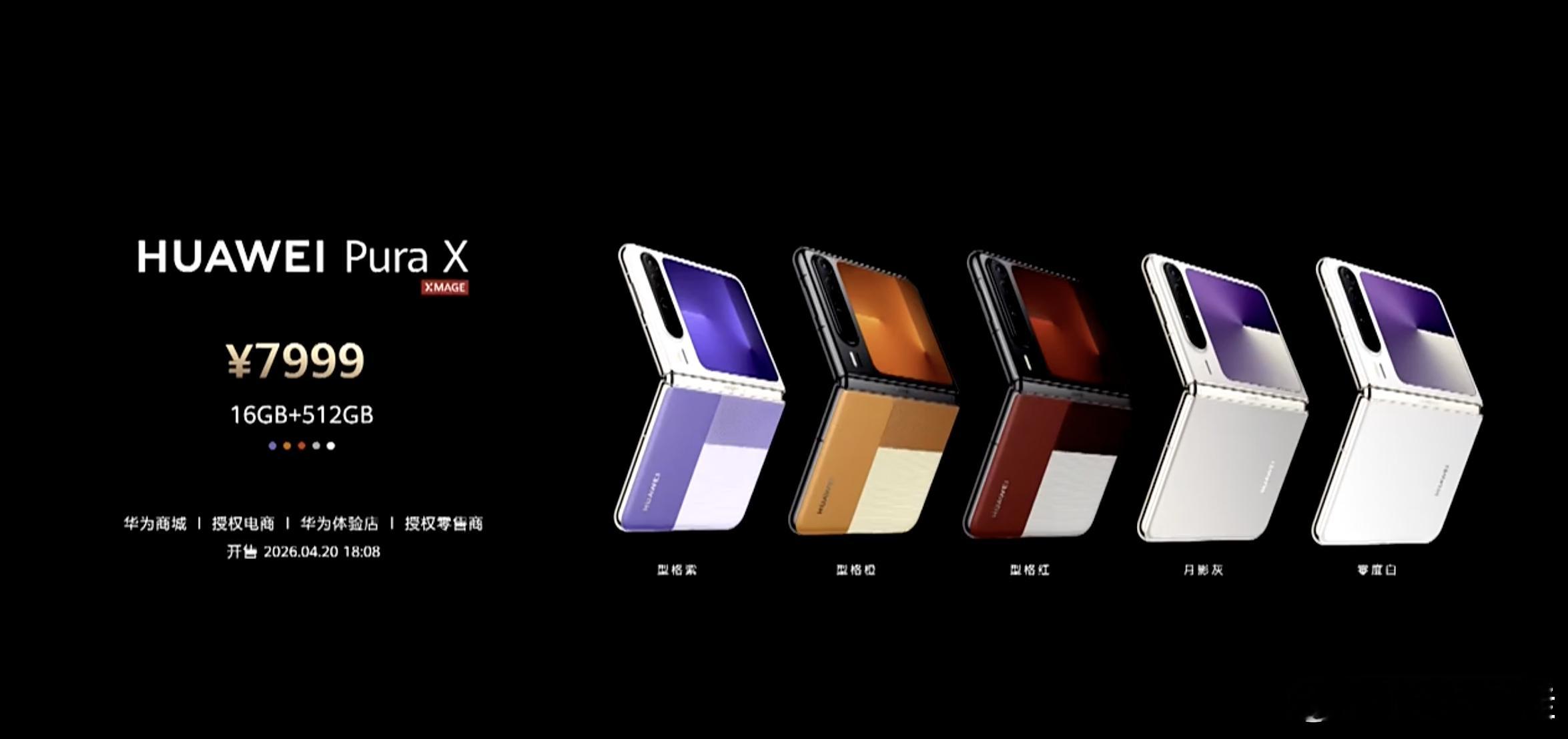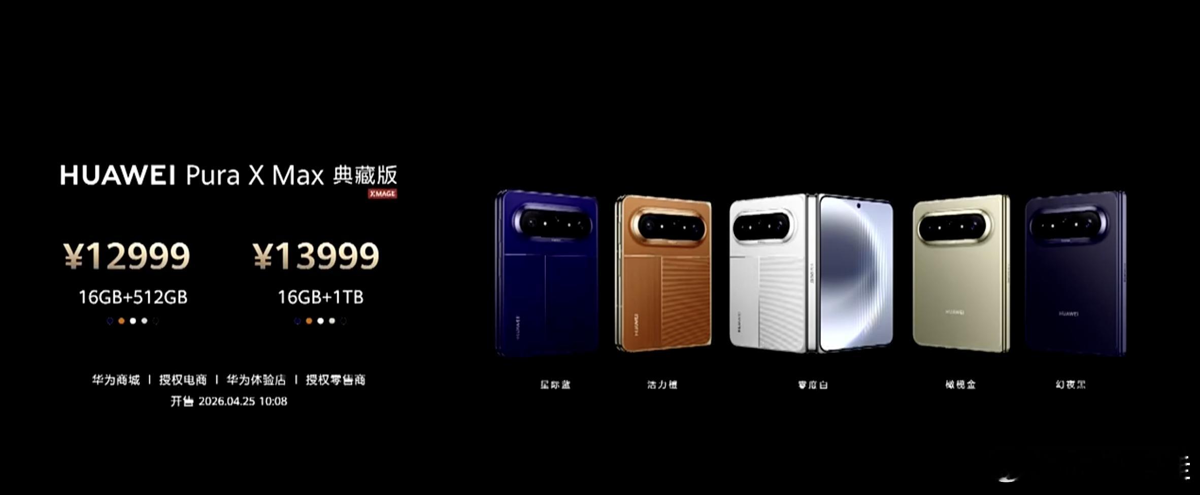 华为Pura X:16+512GB,7999元;华为Pura X Max:12+256GB,10999元起;华为Pura X Max:16+256GB,12999元起;