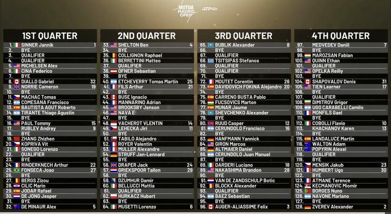 马德里1000赛 男单正赛签表出炉🔥 感觉也可以叫辛纳挑战赛