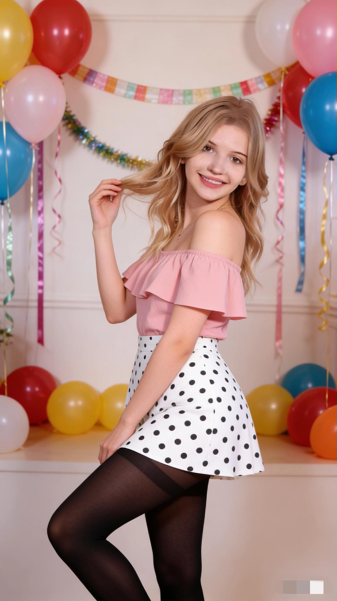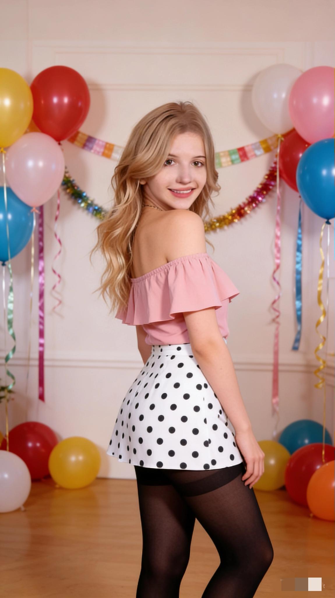 少女心满满,粉色露肩上衣搭配波点短裙,背景气球和彩带点缀,甜美又俏皮!🎈💖