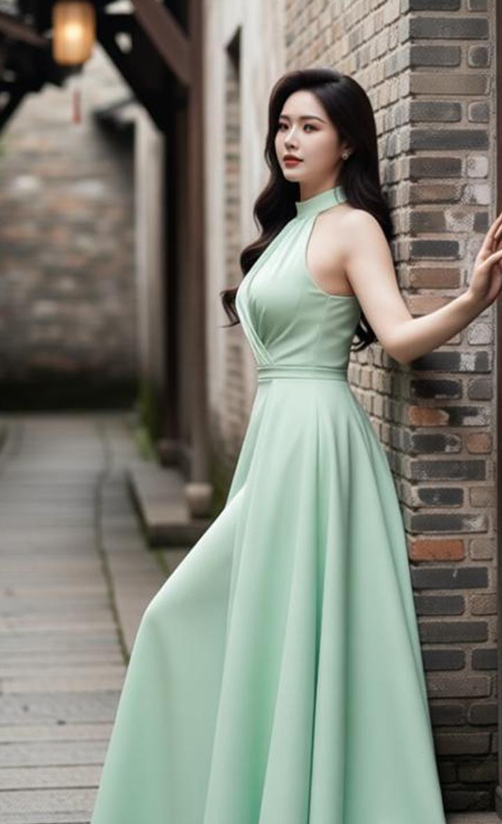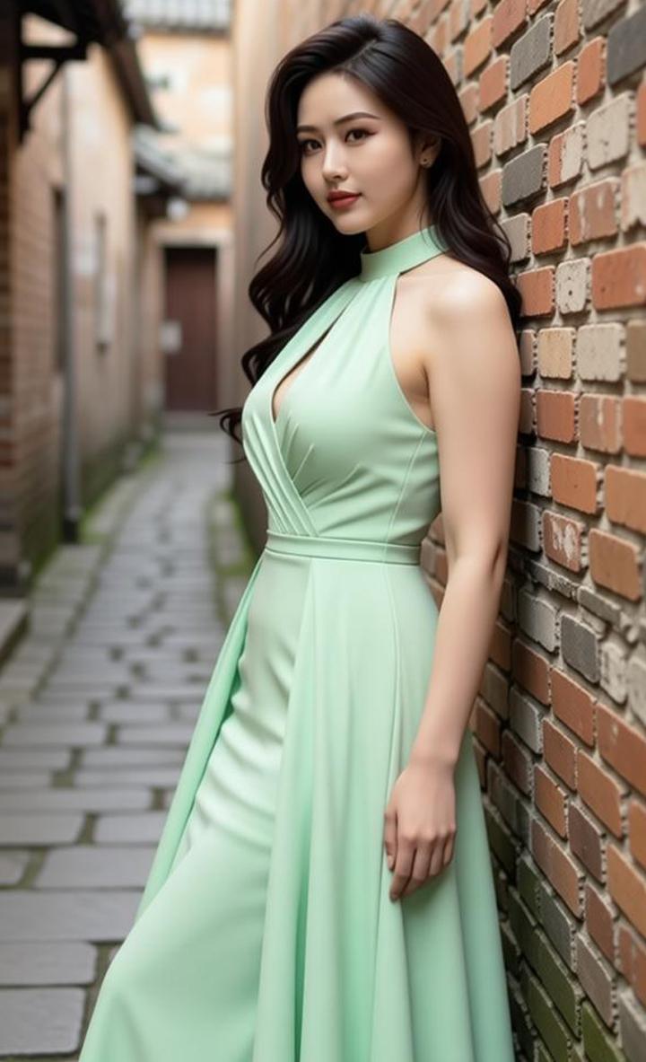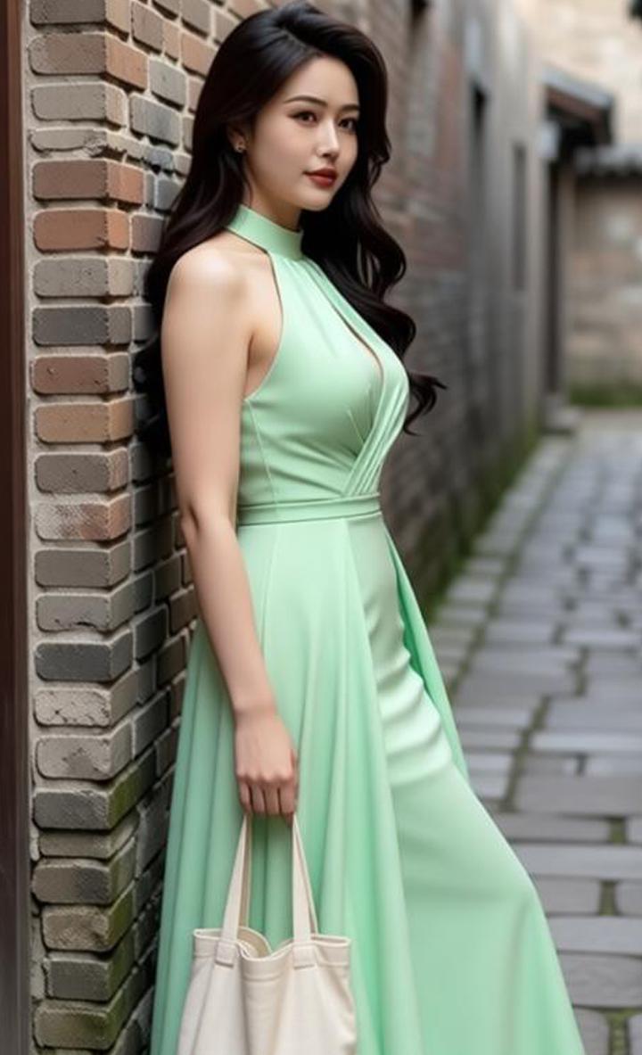 一袭浅绿挂脖长裙的顾以宁,静倚墙畔,发丝在风里漾开温柔的弧度。衣料垂落的线条,与巷弄的古朴相融,将现代的雅致与旧时光的沉静悄然衔接。她眼波流转间,似藏着巷弄的故事,又似在与岁月轻声对话,让这方寸老巷,多了几分诗意的怅惘与鲜活的灵动。