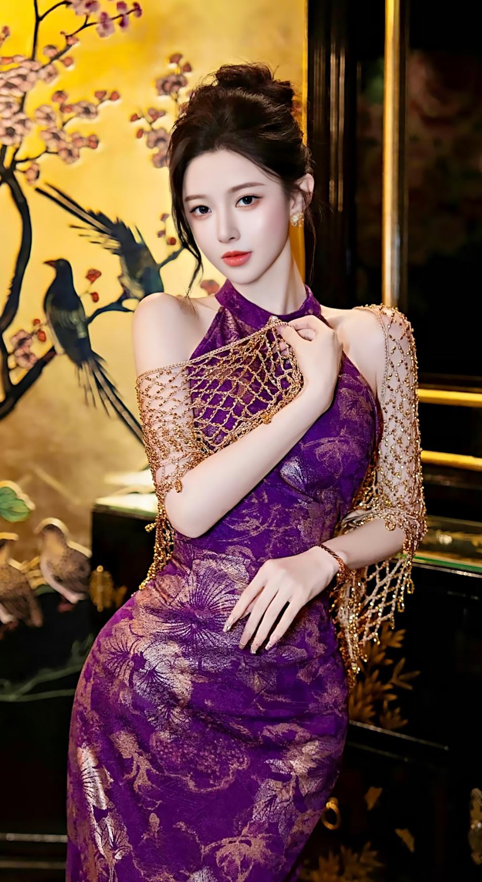 从鎏金闪片的热烈,到紫韵旗袍的温婉,从清透纱裙的灵动,到重工刺绣的典雅,每一套造型,都是一场关于美的修行。