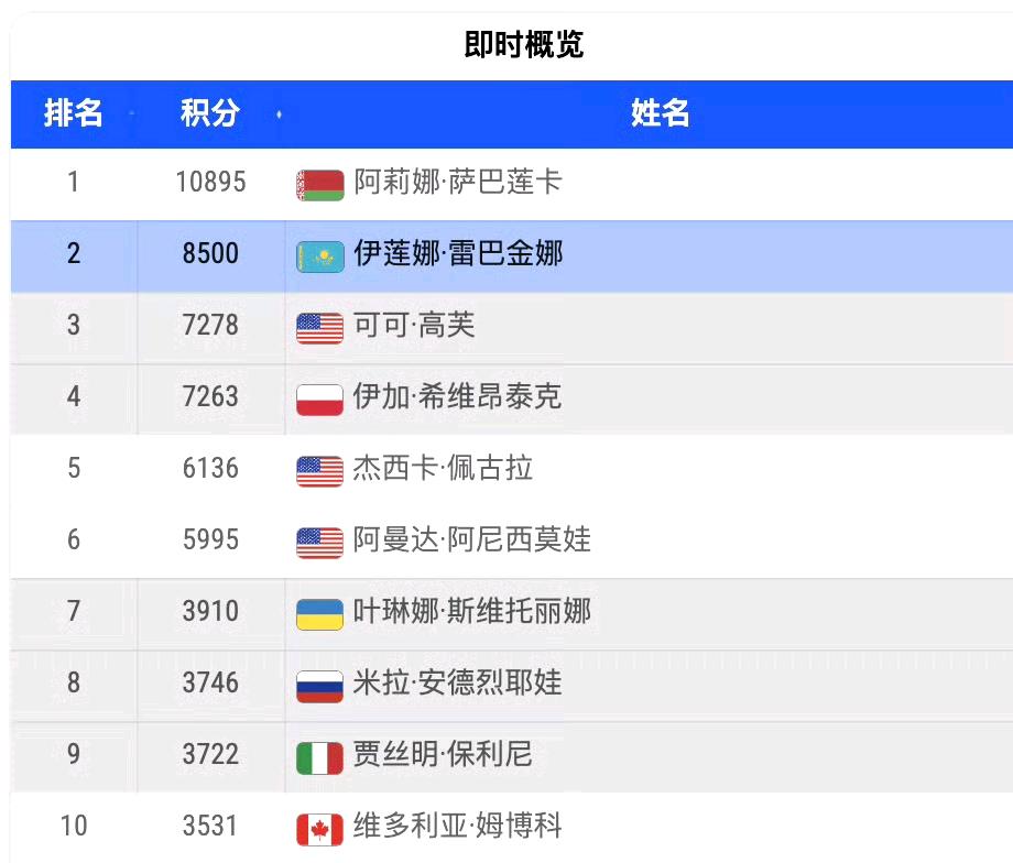 谁能想到一年前她甚至跌出了前10!一切都要从宁波站夺冠并且锁定年终资格说起…… 莱巴金娜凭借斯图加特夺冠的500分,冠军排名反超萨巴伦卡重返世界第一。 世界排名方面,她排名第二,比萨巴少了2395分。想登顶世界第一,难度太大了。