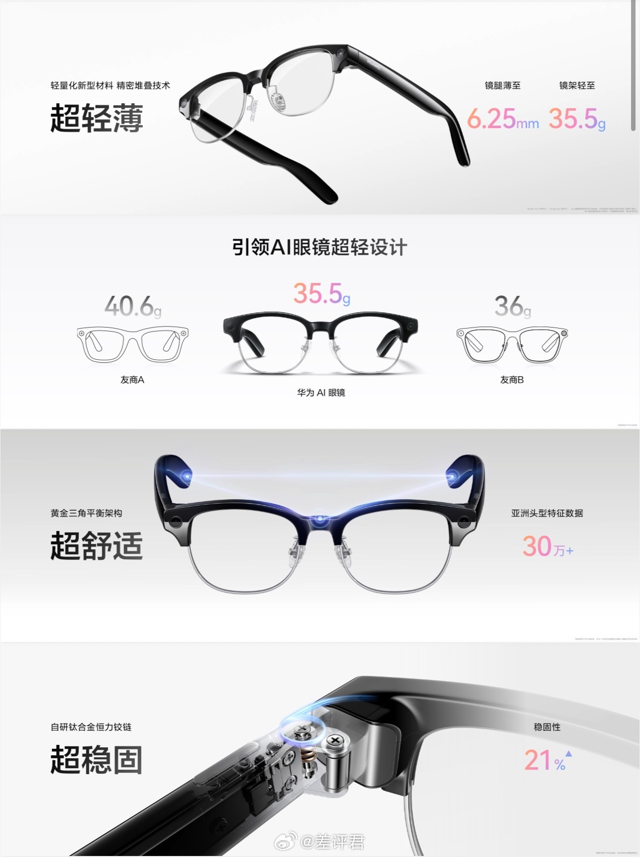 刷到华为发了AI眼镜,随便唠两句。35.5克,挺轻的,比我日常戴的黑框轻一些,整体看着也比较自然不笨重,这个华为一贯的风格我觉得还挺适合日常带的。1200万像素配上0.7秒闪拍和构图校正,目前看下来在眼镜这块还是挺能打的,至少拍出来不虚不糊,而且很高清,色彩也不错。小艺看世界那个实时交互有点意思,你看到啥它聊啥,感觉出去玩能用上,准备改天去门店试试~ #华为发布业界最轻AI眼镜#