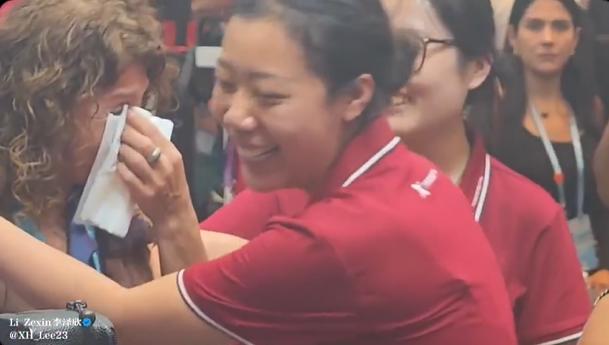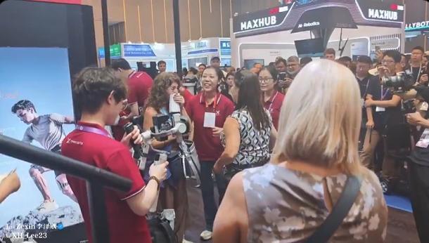 在广集会上,一位患有下半身残疾的外国女孩,使用中国外骨骼设备,独立完成了站立和行走,她的家人感动得流下了眼泪,工作人员及时为她送上暖心的拥抱。