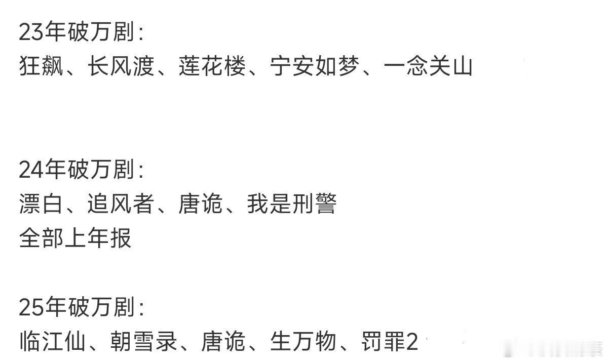 破万剧没入TOP10的有:2023年:《长风渡》《莲花楼》《宁安如梦》《一念关山》2024年:《追风者》2025年:《临江仙》