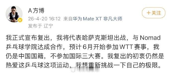 看到方博正式宣布复出,将代表哈萨克斯坦参加WTT赛事,内心感触颇深。作为一名34岁的老将,在退役后重新恢复训练、转换注册身份再次踏上国际赛场,这本身就需要莫大的勇气与决心。他清晰说明“不改变国籍、不参加三大赛”,这份坦荡与界限感,也体现了对规则和初心的尊重。许多球迷还记得他2015年世乒赛与马龙的经典对决,也记得他“世青赛四冠王”的锋芒。如今他选择以这种方式回归,无关胜负,更关乎一名运动员对赛场的纯粹眷恋与自我挑战。正如他的前辈、同样曾“走出去”的郝帅所言:“重返赛场是一件好事,人各有志。”——对于仍怀热爱、仍有余力的选手而言,能继续打球,本身就是一种幸福。竞技体育的舞台很大,不止有顶尖的领奖台,也应有容纳不同阶段、不同身份选手继续发光的一席之地。无论是为了延续热爱、挑战自我,还是为了传授经验、交流技术,只要合规、真诚,每一种选择都值得尊重。祝福方博。愿你在热爱的赛场上,继续享受乒乓球最本真的快乐。方博回应代表哈萨克斯坦参赛 乒乓球