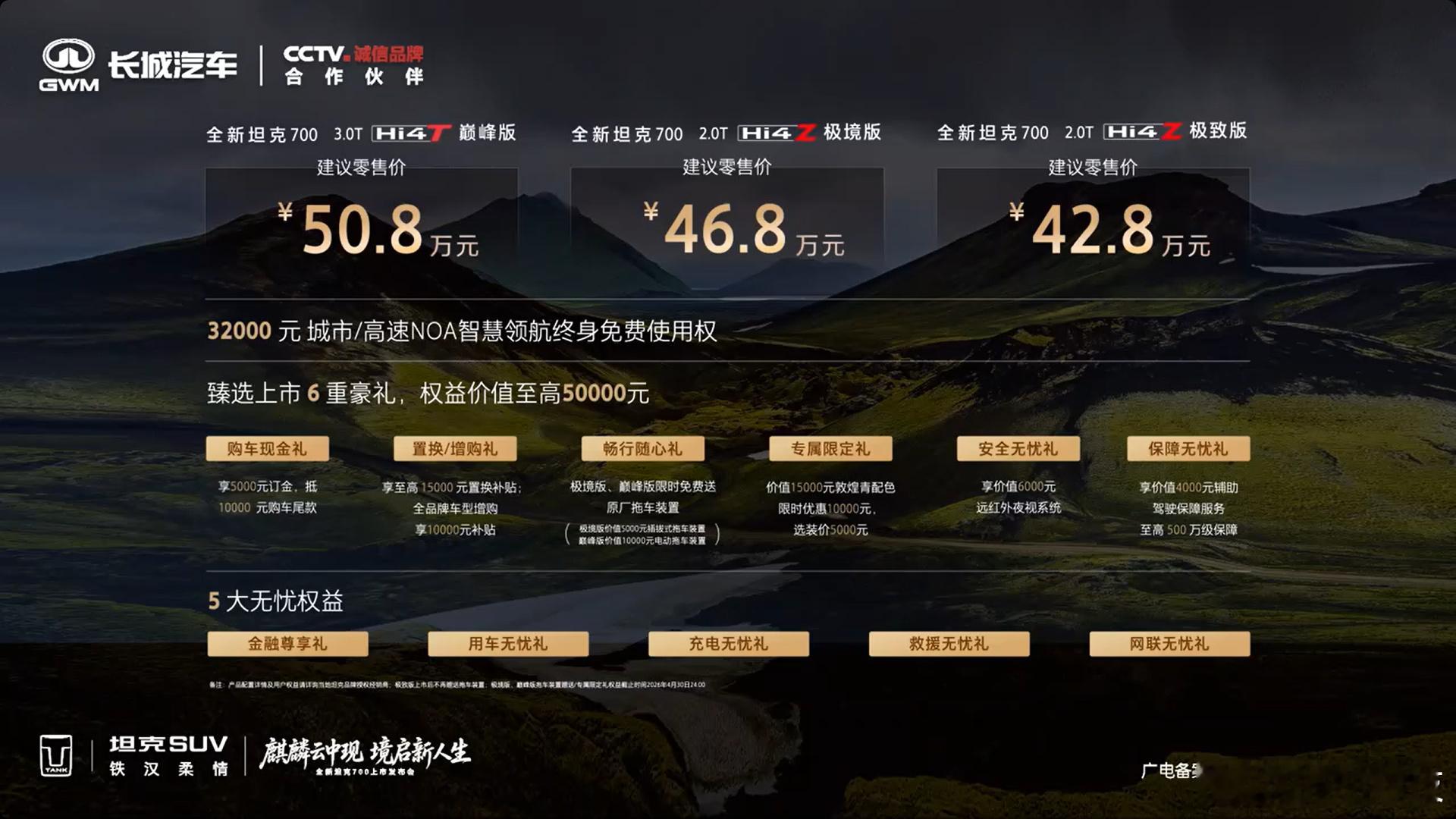 同学们,全新坦克700正式上市啦,共3款车型,Hi4-T巅峰版售价50.8万元、Hi4-Z极境版售价46.8万元、Hi4-Z极致版售价42.8万元。是男人就买一台,好不好!