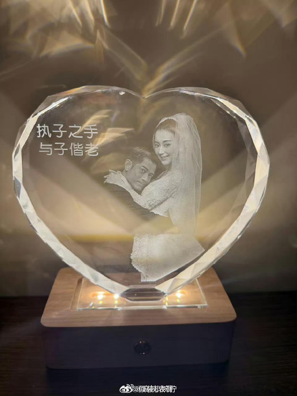 郭富城买了让女友痛哭流涕的礼物2026年4月18日,郭富城为妻子方媛庆祝结婚九周年,赠送一款心形发光水晶摆件,刻有两人婚纱照及“执子之手与子偕老”字样。该礼物是网购平台常见的平价定制款(售价约数十至数百元),方媛在社交媒体发文回应“时光为证,平凡日子里有你便是最好的时光”,并附合照(郭富城单手比“9”手势)