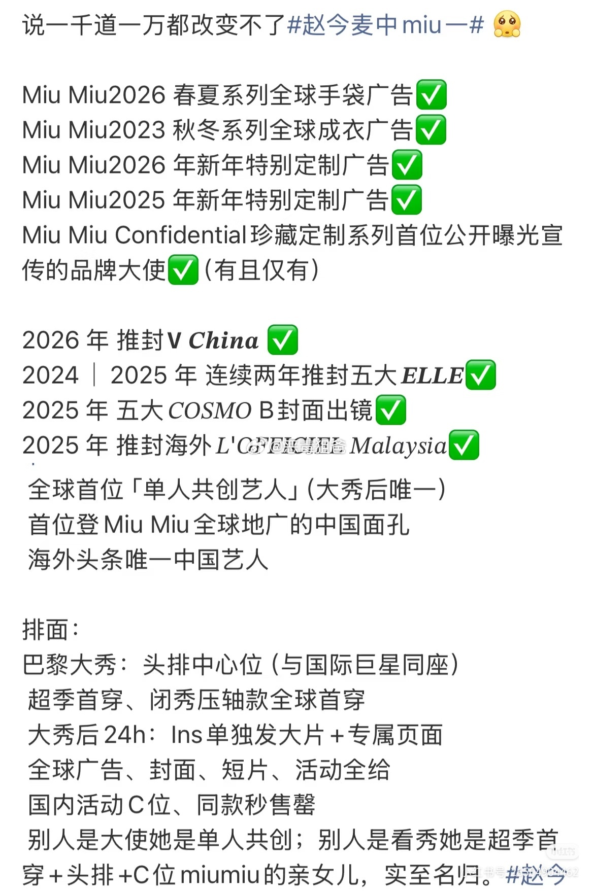 赵今麦已达成Miu Miu最重要最值钱的成衣广✅手袋广✅ 同时连庄 𝟐𝟎𝟐𝟓.𝟐𝟎𝟐𝟔 新年广告✅Miu Miu 𝐶𝑜𝑛𝑓𝑖𝑑𝑒𝑛𝑡𝑖𝑎𝑙珍藏定制系列首位曝光宣传大使(单人)✅顶级摄影师𝑆𝑡𝑒𝑣𝑒𝑛 𝑀𝑒𝑖𝑠𝑒𝑙掌镜拍摄✅赵今麦的中miu1待遇地位不是同期🌸买通稿就能埋没的
