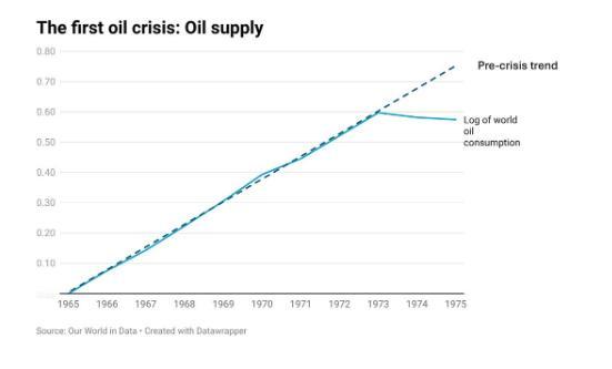 我所知道最接近的案例,是1973年赎罪日战争后的石油冲击。(1979年的伊朗危机更复杂,涉及大量投机性价格波动)。1973年之后全球石油供应仅小幅下降,但此前供应一直快速增长,因此相对于趋势出现了巨大缺口。