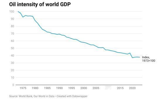 即使海峡继续关闭,如今全球经济对石油的依赖程度也远低于1973年。以下是全球“石油强度”指数,即每单位实际GDP所消耗的石油量,以1973年为100。