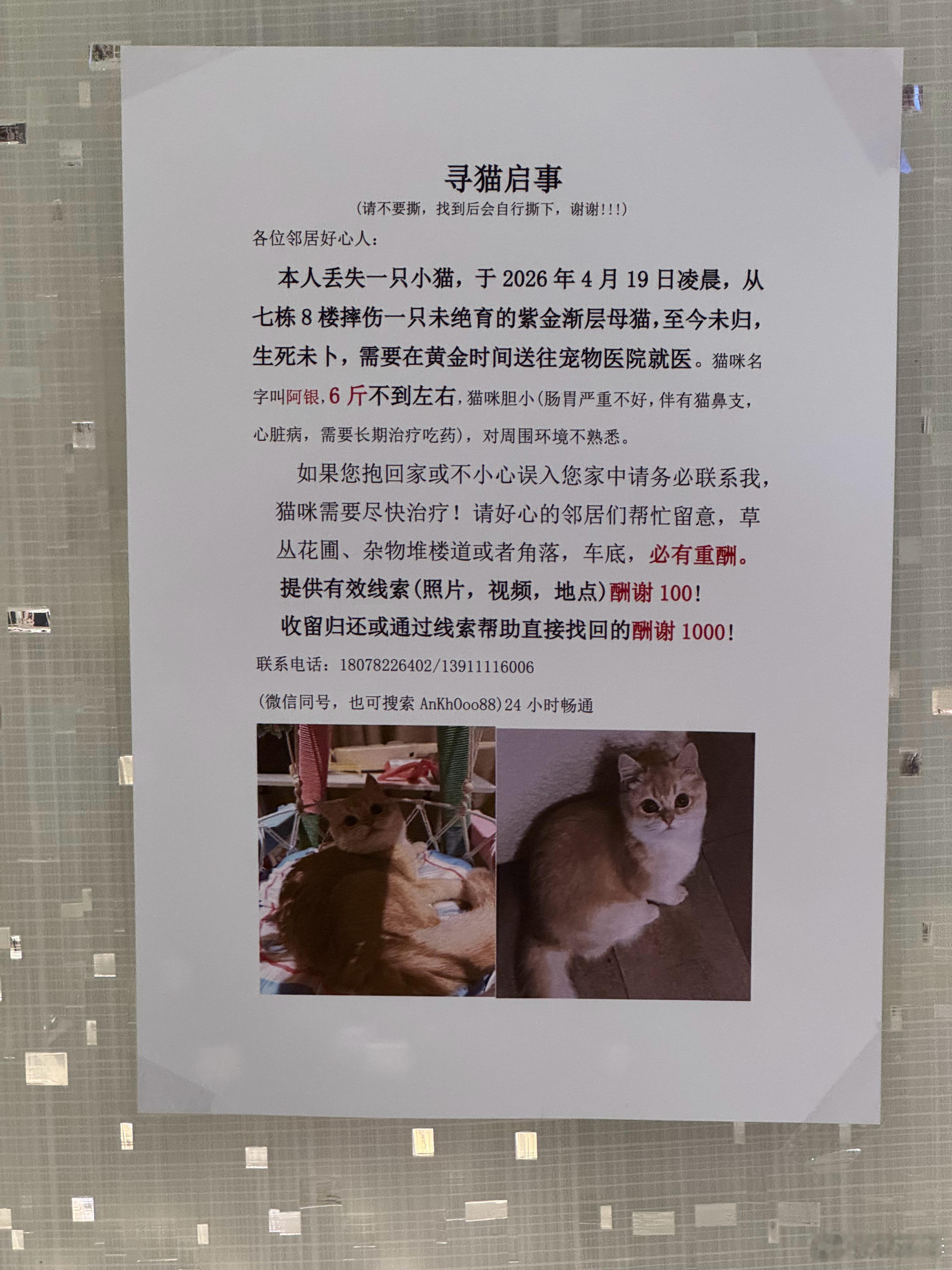电梯看到的,多可爱一只金渐层小母猫啊,带伤走失一天了,希望周边看到的朋友,及时联