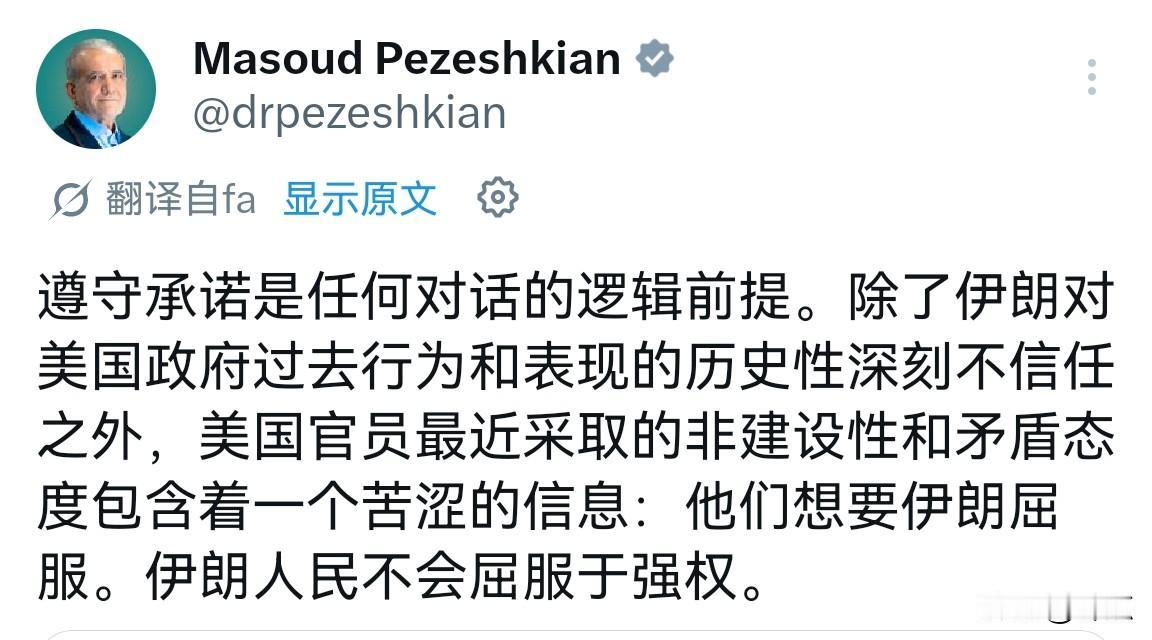 伊朗总统佩泽什基安发文写道:“遵守承诺是任何对话的逻辑前提。除了伊朗对美国政府过去行为和表现的历史性深刻不信任之外,美国官员最近采取的非建设性和矛盾态度包含着一个苦涩的信息:他们想要伊朗屈服。伊朗人民不会屈服于强权。”