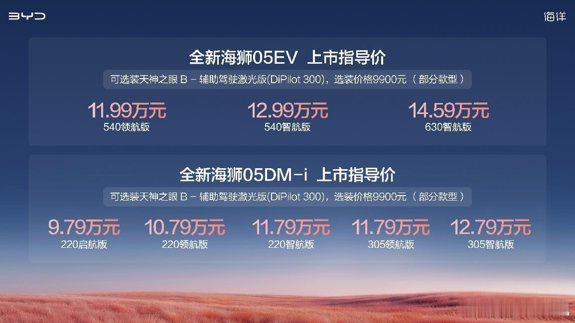 而全新海狮05DM-i升级提供CLTC纯电续航220km和305km两种版本可选,城市日常通勤“一周一充”基本不用油,满油满电综合续航最高可达2105km,并且还有超低油耗表现。全新海狮05可选装天神之眼 B - 辅助驾驶激光版,升级搭载激光雷达,提供城市领航辅助、高快领航辅助等更多辅助驾驶功能,让用户畅享智慧出行带来轻松、省心与便捷。