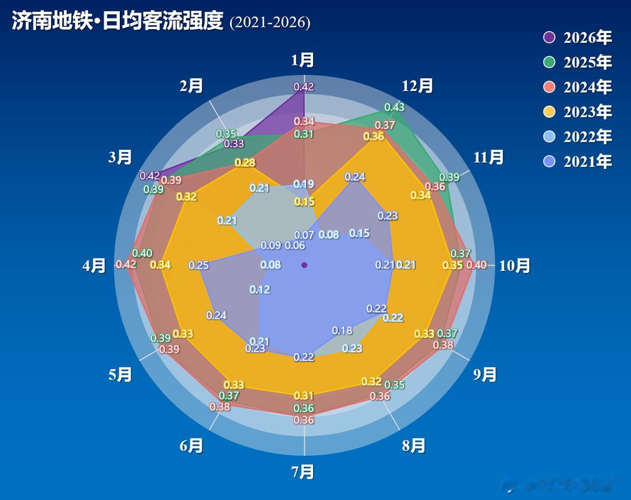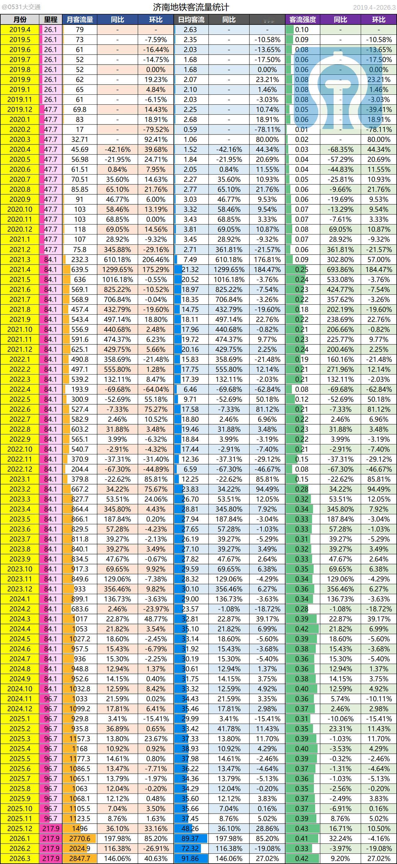 2026年3月济南地铁运送旅客2847.7w人次,创济南地铁运营以来单月旅客运送量新高,同比2025年增长146.06%,环比2月增长40.63%;日均运送旅客91.86w人次,同比2月增长27.02%,较1月日均增长2.5w人次;客流强度0.42w人次每日每公里,同比增长9.2%[奸笑][奸笑]。3月份客流与我们此前预测的2900w人次相差不大,预计接下来几个月客流会呈现震荡缓慢增长的态势[可怜][可怜];公交/地铁客流对比方面,2025年济南公交日均运送旅客156w人次,2025年底地铁网络扩容后预计公交客流会有至少10%的下滑,目前济南地铁的客流量应该至少达到公交客运量的70%左右,预计年底6号线西段开通后地铁客流可以超过公交客流[无辜笑][无辜笑]。受小长假与气温回升影响,预计4月份济南地铁客流呈现总客流持平,大概在2850w人次左右,日均客流应该会持续增加[机智][机智]
