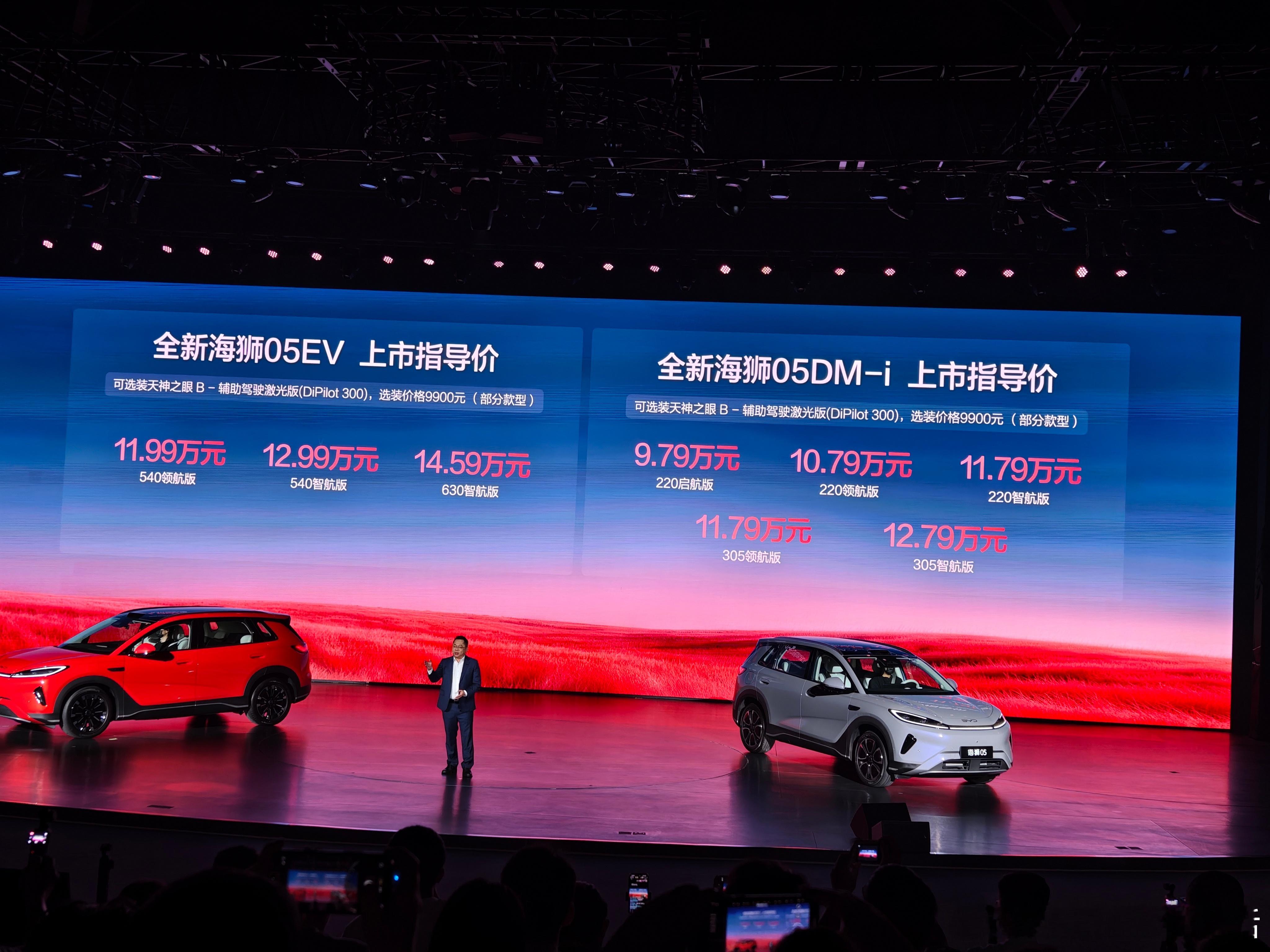 ▫️全新海狮05 DM-i混动版:9.79万元-12.79万元▫️全新海狮05 EV纯电版:11.99万元-14.59万元DM-i混动系列,带来5个配置梯度:从9.79万的220km启航版,到12.79万的305智航版,覆盖不同家用场景。可油可电,综合续航超1200km