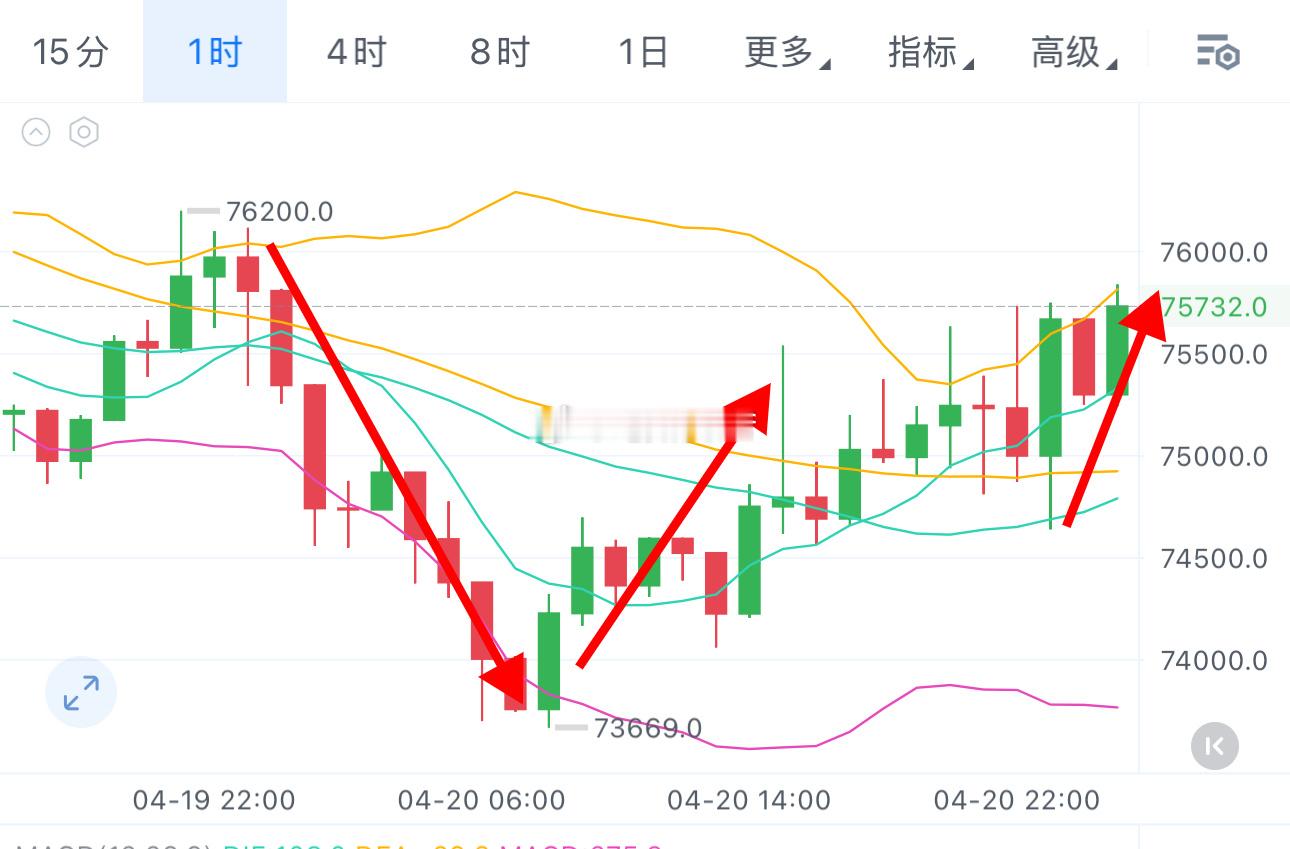 76000箜说了看74000,2000点,73700哆也提示看75500,1800点,并且昨晚回撤74700附近多,目前又是1000点,
