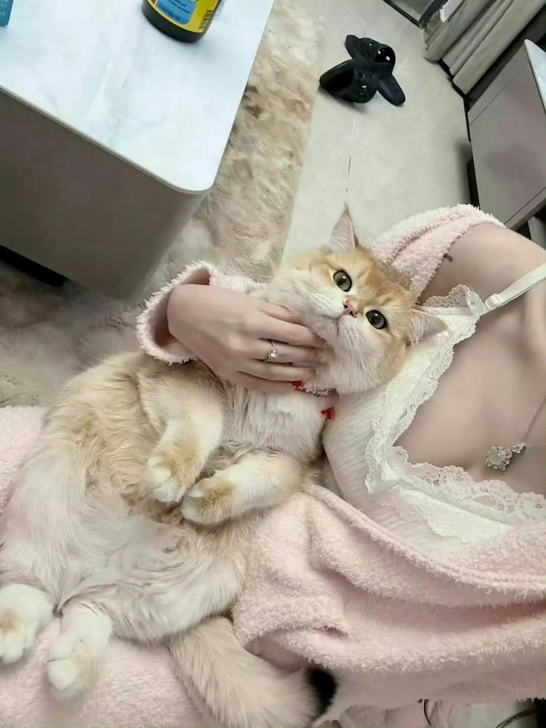 这谁能扛得住,小猫咪躺在男子的怀里,深情的望着男子,目不转睛的看着他,伸出两只毛